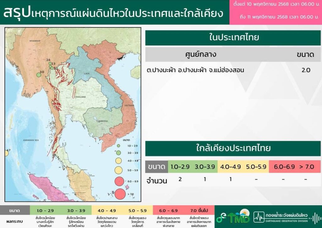 ในช่วงวันที่ 10–11 พฤศจิกายน 2568 พบแผ่นดินไหวขนาด 2.0–4.7 แมกนิจูด ในประเทศเมียนมา จังหวัดแม่ฮ่องสอน และหมู่เกาะนิโคบาร์ ซึ่ง ไม่มีผลกระทบต่อประเทศไทย