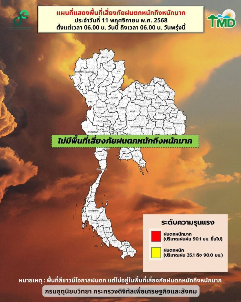 วันที่ 11–12 พ.ย. 68: ประเทศไทยตอนบนมีฝนฟ้าคะนองบางแห่ง ส่วนภาคใต้ยังมีฝนตกต่อเนื่องจากลมตะวันตก
