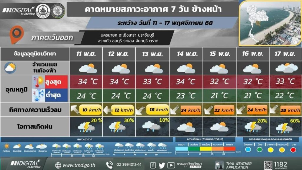 วันที่ 11 พฤศจิกายน 2568 กรมอุตุนิยมวิทยาเผยการพยากรณ์อากาศล่วงหน้า 7 วัน (ระหว่างวันที่ 11–17 พฤศจิกายน 2568) โดยระบุว่าในช่วงต้นสัปดาห์ ประเทศไทยตอนบนจะมีฝนลดลง ส่วนภาคใต้ยังคงมีฝนฟ้าคะนองต่อเนื่องจากอิทธิพลของลมตะวันตก ขณะที่กลางสัปดาห์เป็นต้นไป จะเริ่มมีมวลอากาศเย็นจากจีนแผ่เข้าปกคลุมประเทศไทย ส่งผลให้อุณหภูมิลดลงทั่วประเทศ
