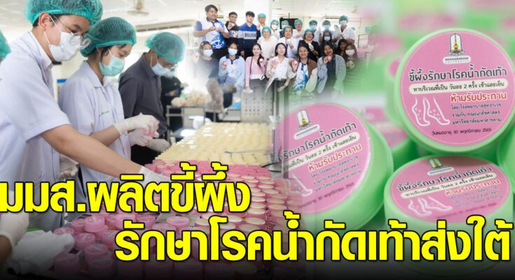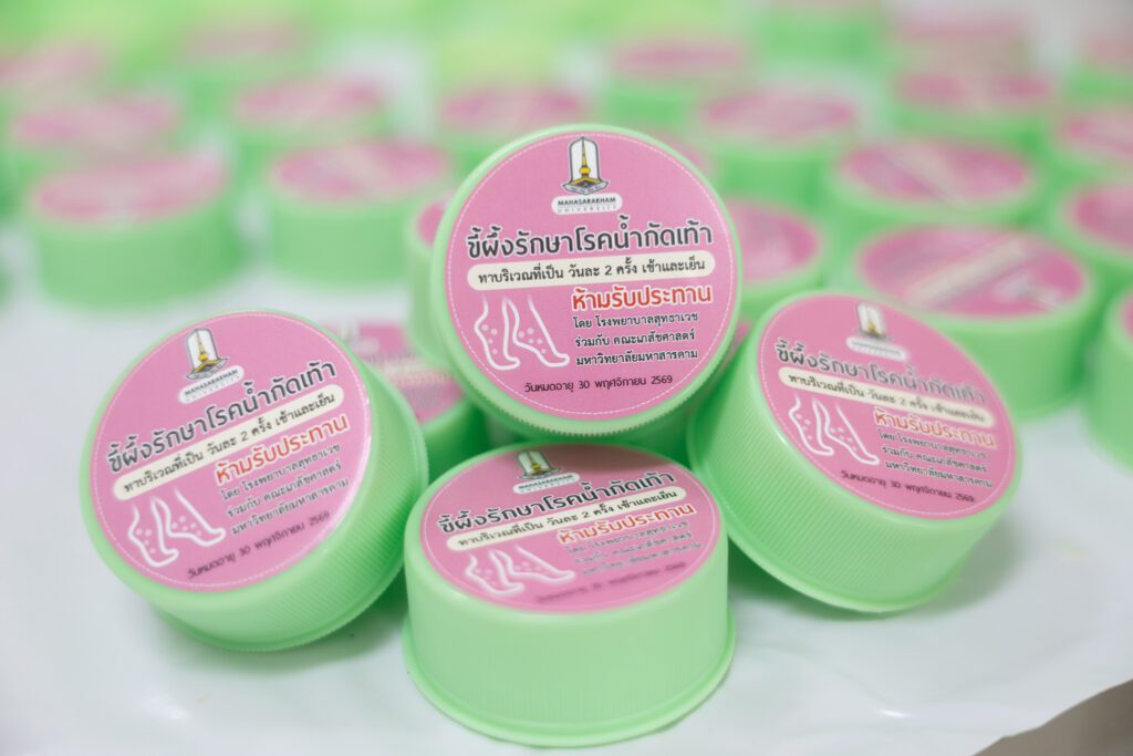 เพื่อช่วยบรรเทาความเดือดร้อน คณะเภสัชศาสตร์ มมส ได้ผลิตขี้ผึ้งรักษาน้ำกัดเท้า จำนวน 5,000 ตลับ โดยใช้ส่วนผสมที่มีฤทธิ์ฆ่าเชื้อราและลดอาการอักเสบได้อย่างมีประสิทธิภาพ ทุกตลับมีคำแนะนำการใช้ระบุใต้ฝา ทาวันละ 2 ครั้ง เช้าและเย็น พร้อมย้ำว่าห้ามรับประทาน