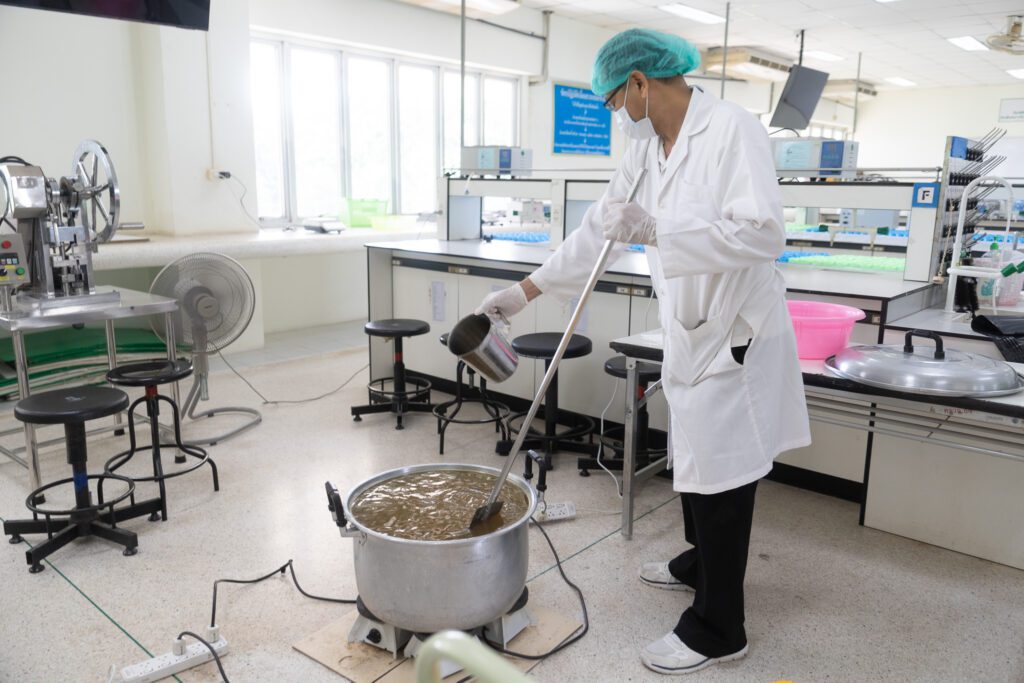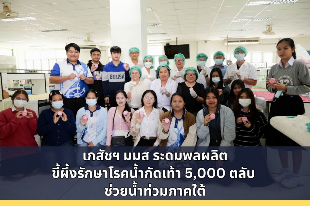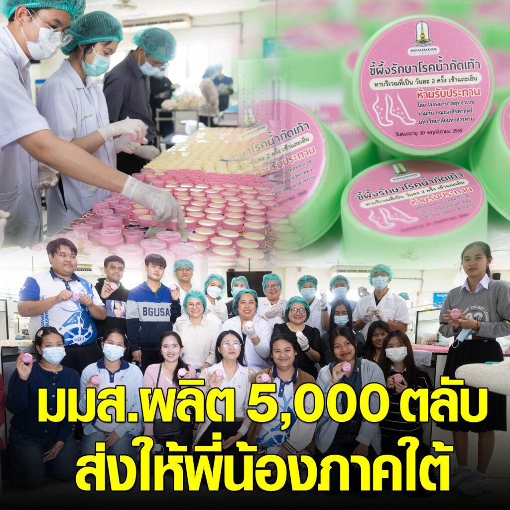 ที่ห้องปฏิบัติการเทคโนโลยีเภสัชกรรม คณะเภสัชศาสตร์ มหาวิทยาลัยมหาสารคาม ผู้ช่วยศาสตราจารย์ ดร.ภญ.รุจิลักขณ์ รัตตะรมย์ คณบดีคณะเภสัชศาสตร์ ได้นำคณาจารย์ บุคลากร และนิสิตจิตอาสากว่าหลายสิบคน ระดมกำลังผลิตขี้ผึ้งรักษาโรคน้ำกัดเท้าอย่างเร่งด่วน บรรจุยา ติดฉลาก และจัดเตรียมเพื่อส่งลงพื้นที่ภาคใต้ทันที
