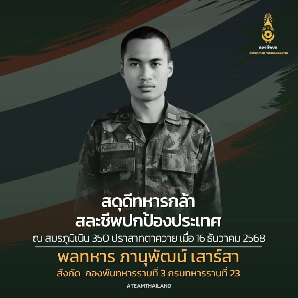 เมื่อเวลา 13.00 น. วันที่ 24 ธันวาคม 2568 ผู้สื่อข่าวรายงานว่า พล.ต.ณัฏฐ์ ศรีอินทร์ รองแม่ทัพภาคที่ 2 ลงพื้นที่ตรวจเยี่ยมบ้านพักของ พลทหาร ภานุพัฒน์ เสาร์สา หรือ “พลทหารวุ้น” สังกัดกองพันทหารราบที่ 3 กรมทหารราบที่ 23 (ร.23 พัน.3) ซึ่งเสียชีวิตจากการปฏิบัติหน้าที่ป้องกันอธิปไตยของชาติ จากเหตุปะทะบริเวณสมรภูมิเนิน 350 อำเภอพนมดงรัก จังหวัดสุรินทร์ เมื่อวันที่ 16 ธันวาคมที่ผ่านมา