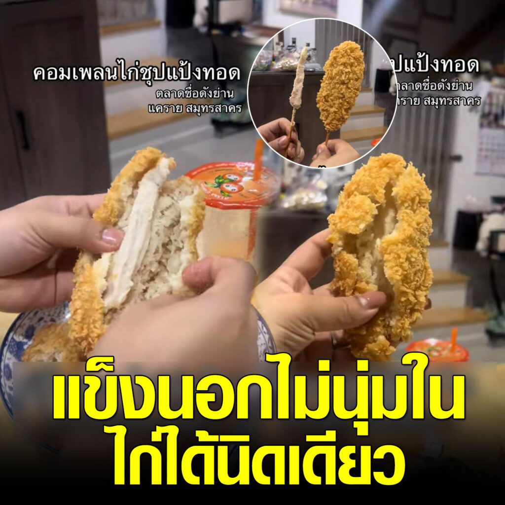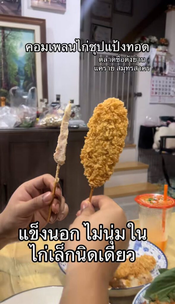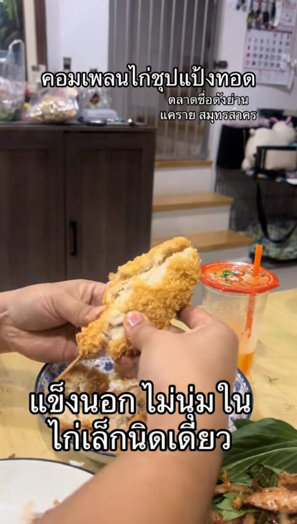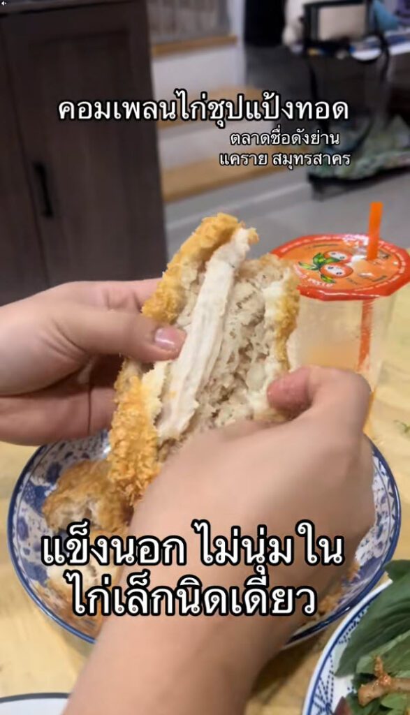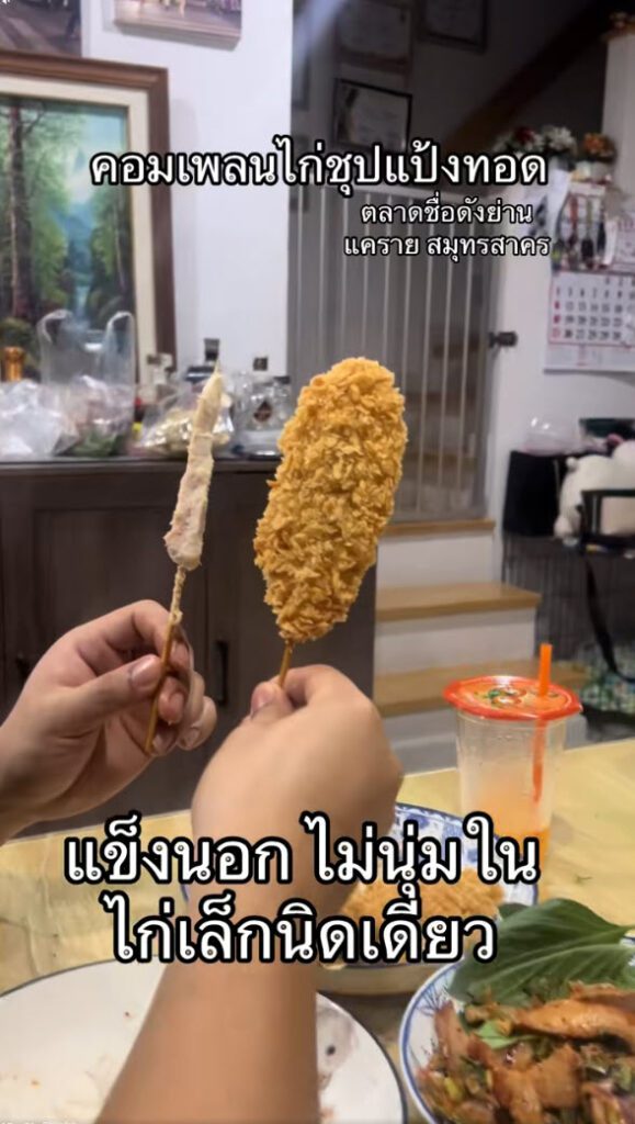 ล่าสุด ผู้ใช้ TikTok @ploifon.raticha ได้โพสต์คลิปรีวิวอาหารจากตลาดชื่อดังย่านแคราย จังหวัดสมุทรสาคร โดยในคลิปเป็นการเปรียบเทียบเมนู คอมเพลนไก่ชุบแป้งทอด ที่ภายนอกดูชิ้นใหญ่ หนา และกรอบน่ากิน แต่เมื่อหักดูด้านในกลับพบว่า เนื้อไก่มีปริมาณน้อยมาก แทบเป็นเพียงชิ้นเล็ก ๆ อยู่ภายในชั้นแป้งหนา