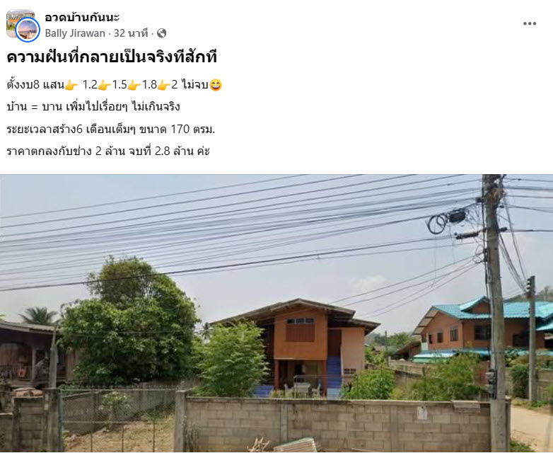 ล่าสุด ทางด้านผู้ใช้เฟสบุ๊ก Bally Jirawan ได้โพสต์แชร์ประสบการณ์ในการสร้างบ้าน ตั้งงบไว้ 2 ล้านบาท แต่ไม่จบ สร้างบ้านเสร็จไปจบที่ 2.8 ล้านบาท โดยได้โพสต์ระบุว่า…