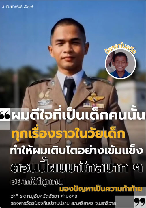 โลกออนไลน์พากันหลั่งไหลส่งกำลังใจและเสียงชื่นชมอย่างอบอุ่น หลังเพจ กองอำนวยการรักษาความมั่นคงภายในภาค 4 ส่วนหน้า เผยแพร่คลิปเรื่องราวชีวิตของชายหนุ่มผู้ไม่ยอมแพ้ต่อโชคชะตา ว่าที่ ร.ต.ท.มูฮัมหมัดอัซฮา คำมงคล หรือที่หลายคนคุ้นชื่อในนาม “น้องอา” ตัวอย่างของคนสู้ชีวิตที่พิสูจน์ให้เห็นว่า จุดเริ่มต้นที่ต่ำ ไม่ได้กำหนดปลายทางของชีวิตเสมอไป