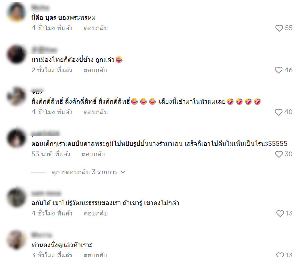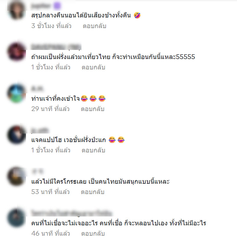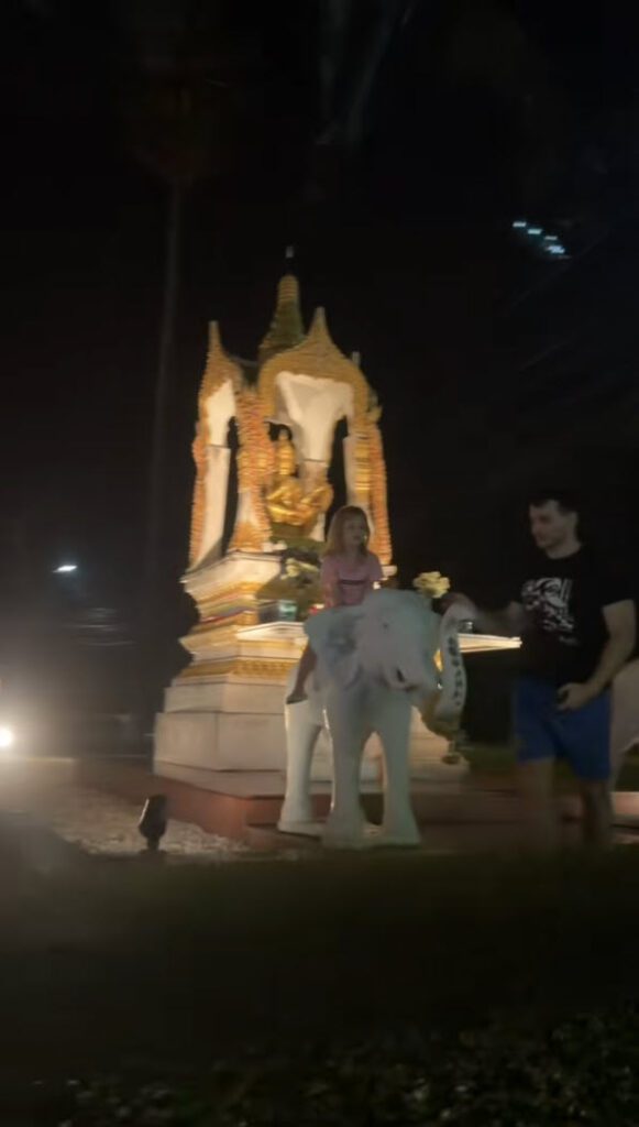 พอกลับไปบ้านก็จะไปเล่าให้เพื่อนๆ ฟังว่ามาขี่ช้างที่ประเทศไทย ฮาๆ ไม่ใช่ช้างนี่ลูก ฮาๆ แล้วเป็นรูปปั้นช้างที่หน้าศาลด้วยนะ ความไม่รู้ คนไทยเห็นแล้วเอ็นดูสุดๆ มาเที่ยวไทยได้ขี่ช้าง