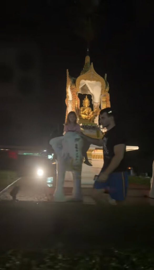 ชาวต่างชาติมาลูกมาเที่ยวไทย เอาลูกขี่หลังช้าง แต่เป็นรูปปั้นช้างหน้าศาล