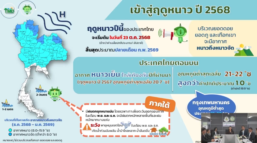 กรมอุตุฯ คาดว่า อุณหภูมิโดยทั่วไปในฤดูหนาวปีนี้จะอยู่ที่ประมาณ 21–22 องศาเซลเซียส โดยช่วงที่จะได้สัมผัสอากาศหนาวที่สุดจะอยู่ระหว่าง เดือนธันวาคม 2568 ถึงมกราคม 2569 โดยเฉพาะบนยอดดอยและพื้นที่ภูเขาสูงอาจมีอุณหภูมิต่ำกว่า 8 องศาเซลเซียส ส่วนพื้นที่กรุงเทพมหานครและปริมณฑล คาดว่าอุณหภูมิต่ำสุดจะอยู่ระหว่าง 18–20 องศาเซลเซียส