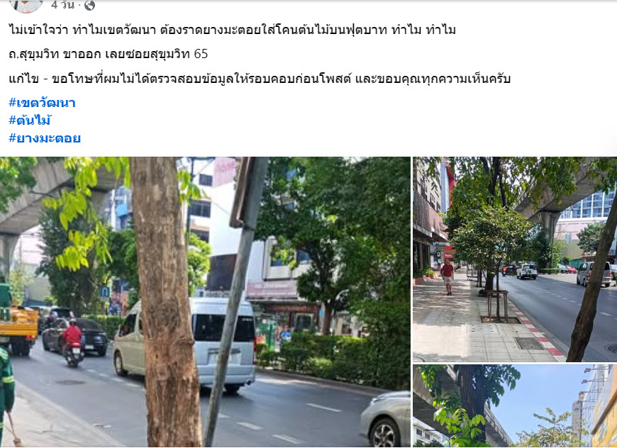 กลายเป็นประเด็นถกเถียงในโลกออนไลน์ เมื่อผู้ใช้เฟซบุ๊ก Burapa Lekluanngarm โพสต์ตั้งข้อสงสัยเกี่ยวกับต้นไม้ริมทางเท้าบริเวณถนนสุขุมวิท เขตวัฒนา หลังพบว่ามีการลาดยางมะตอยบริเวณรากต้นไม้ พร้อมตั้งคำถามว่า วิธีการดังกล่าวจะส่งผลให้ต้นไม้ขาดอากาศและตายในอนาคตหรือไม่