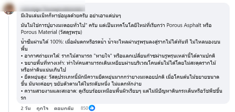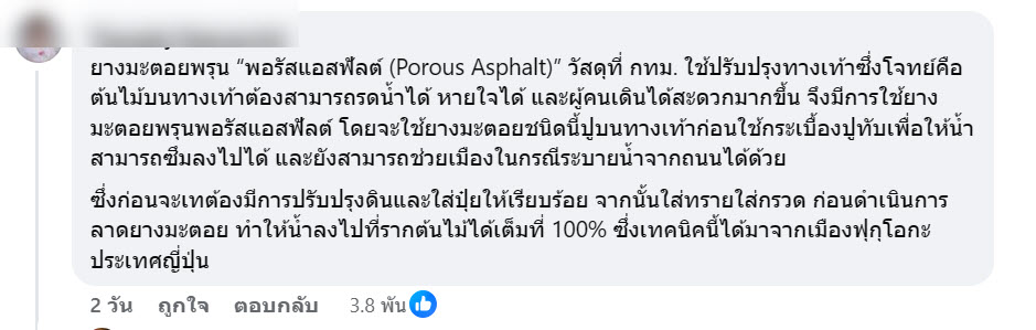 หลังจากโพสต์ดังกล่าวเผยแพร่ออกไป ชาวเน็ตจำนวนมากที่มีความรู้ด้านวิศวกรรมและงานปรับปรุงเมือง ได้เข้ามาชี้แจงว่า ยางมะตอยที่ใช้ในกรณีนี้ไม่ใช่ยางมะตอยทั่วไป แต่เป็น ยางมะตอยพรุน หรือ “พอรัสแอสฟัลต์ (Porous Asphalt)” ซึ่งเป็นวัสดุที่กรุงเทพมหานครใช้ในการปรับปรุงทางเท้า