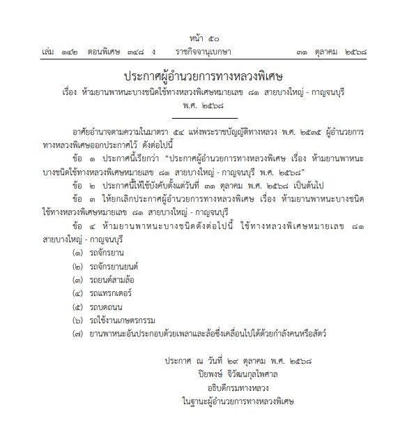 วันที่ 3 พฤศจิกายน 2568 เว็บไซต์ราชกิจจานุเบกษาเผยแพร่ ประกาศผู้อำนวยการทางหลวงพิเศษ เรื่อง “ห้ามยานพาหนะบางชนิดใช้ทางหลวงพิเศษหมายเลข 81 (มอเตอร์เวย์ M81) สายบางใหญ่–กาญจนบุรี พ.ศ. 2568” โดยมีผลบังคับใช้ตั้งแต่วันที่ 31 ตุลาคม 2568 เป็นต้นไป