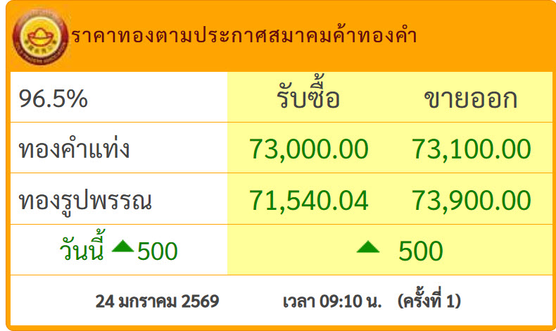 ราคาทองคำในช่วงนี้ยังคงปรับตัวอยู่ในระดับสูงและแพงที่สุดในรอบหลายปี สะท้อนถึงความกังวลของนักลงทุนต่อสถานการณ์เศรษฐกิจโลก ความไม่แน่นอนด้านการเงิน และความผันผวนของตลาดสินทรัพย์อื่น ส่งผลให้ทองคำยังคงถูกมองเป็นสินทรัพย์ปลอดภัยที่ได้รับความนิยมอย่างต่อเนื่อง ล่าสุดตามประกาศสมาคมค้าทองคำ วันที่ 24 มกราคม 2569 ราคาทองคำแท่งรับซื้ออยู่ที่บาทละ 73,000 บาท และขายออกที่บาทละ 73,100 บาท ขณะที่ทองรูปพรรณรับซื้ออยู่ที่บาทละ 71,540.04 บาท และขายออกที่บาทละ 73,900 บาท โดยราคาปรับเพิ่มขึ้นจากวันก่อนหน้าอีก 500 บาท