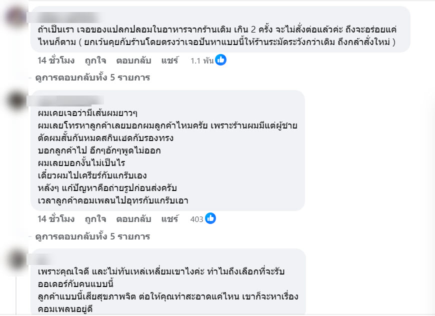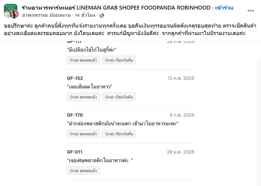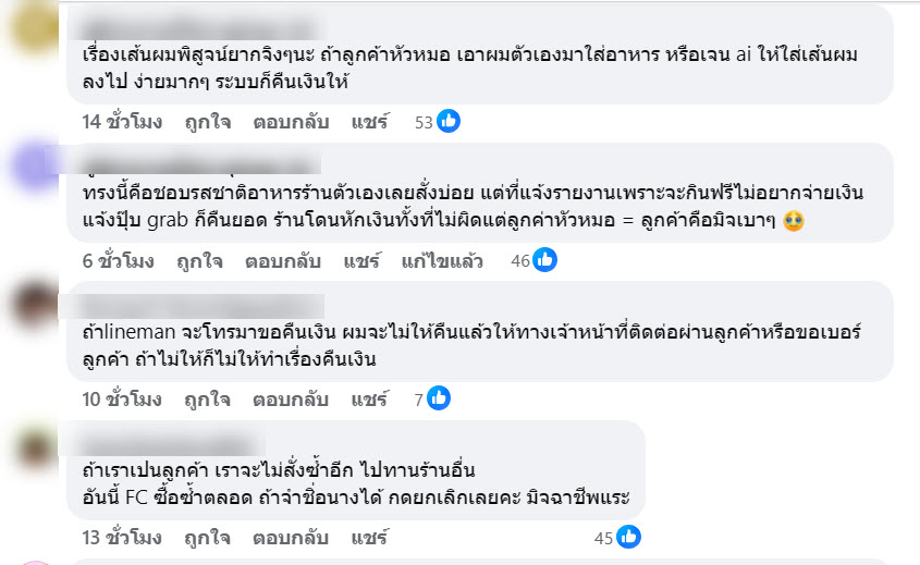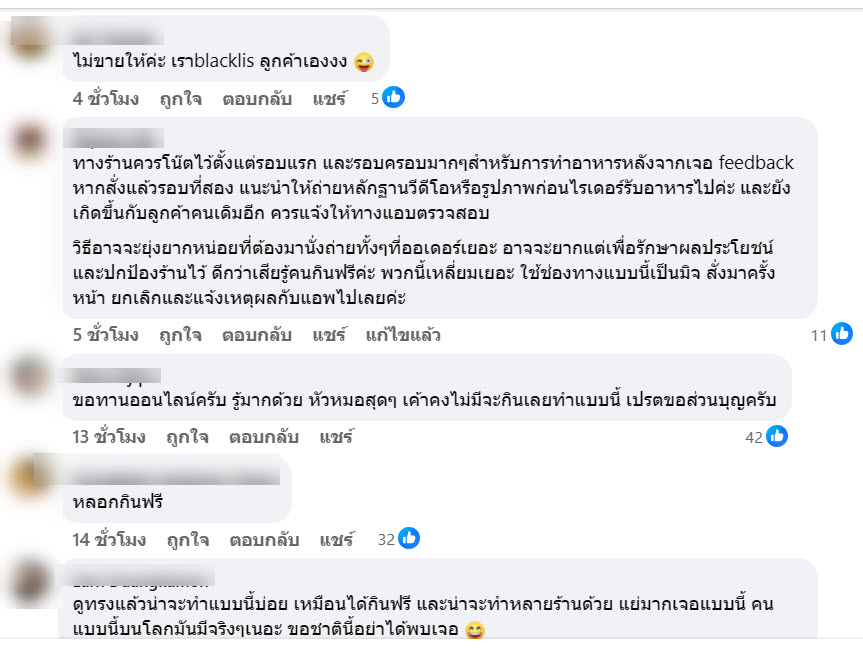 โดยผู้โพสต์ระบุว่า ทางร้านได้ตรวจสอบขั้นตอนการเตรียมอาหารอย่างละเอียดทุกครั้ง รวมถึงตรวจเช็กก่อนส่งอย่างรอบคอบ และจากลูกค้ารายอื่นที่ผ่านมาแทบไม่เคยมีรายงานปัญหาลักษณะดังกล่าว ทำให้เริ่มเกิดความสงสัยว่าการร้องเรียนบางกรณีอาจไม่ใช่ความผิดพลาดจากร้านจริงหรือไม่