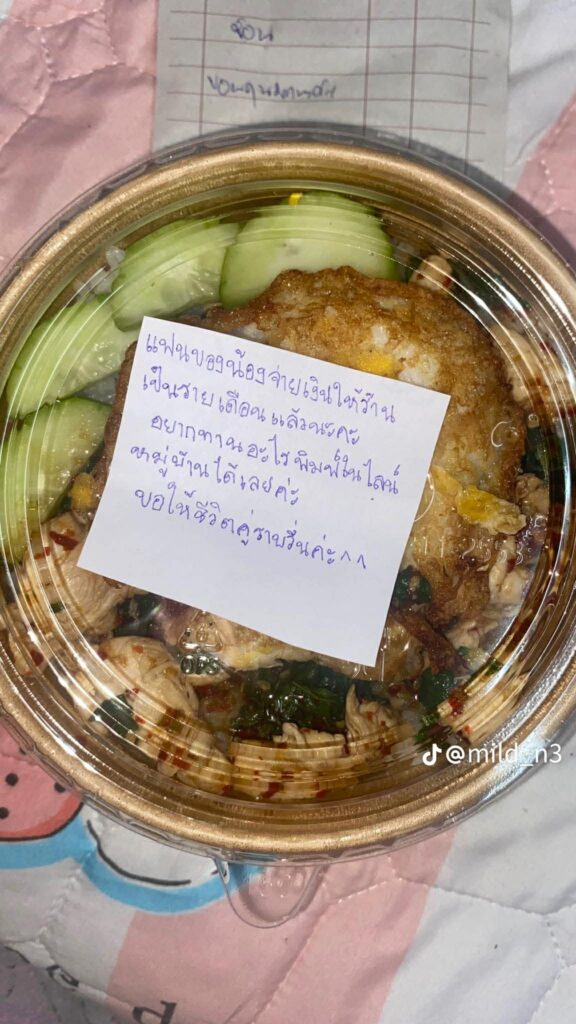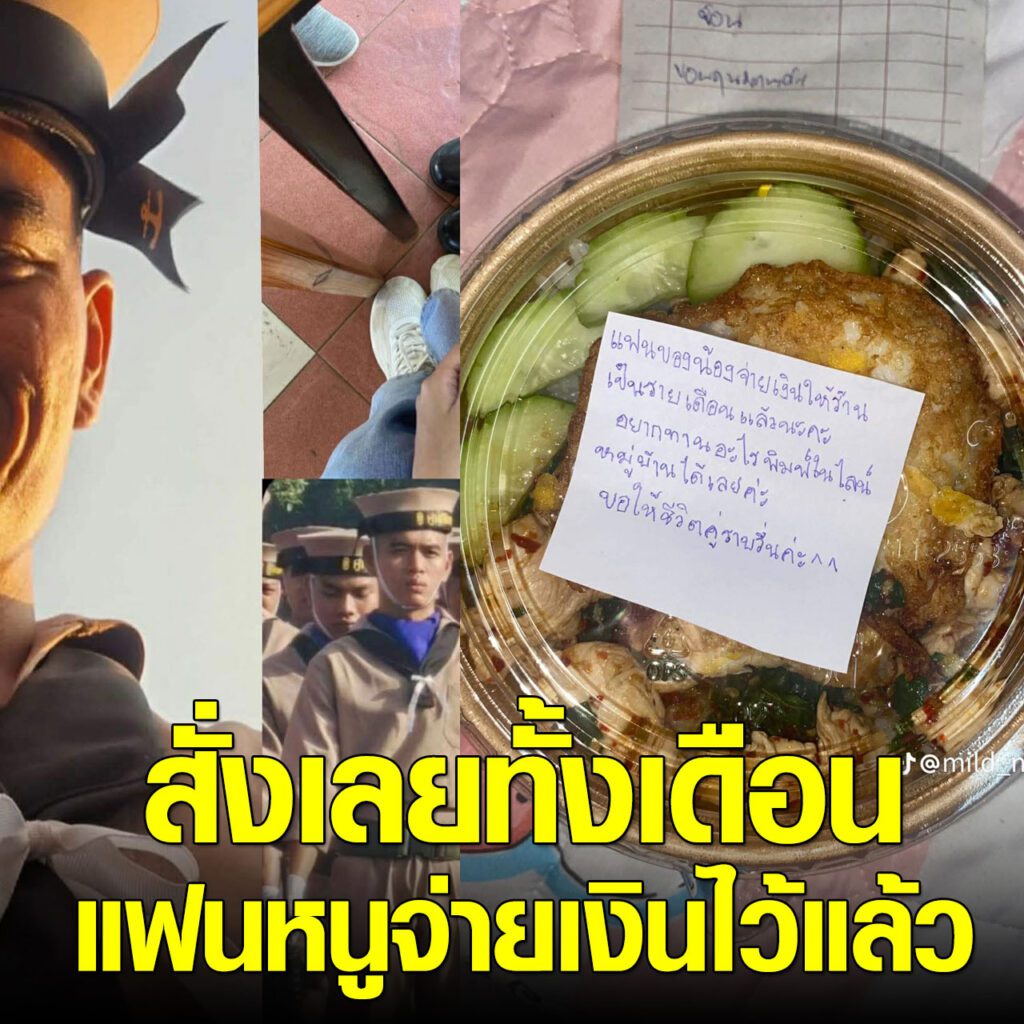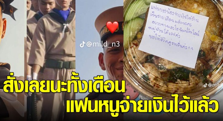 อย่างล่าสุด ทางด้านผู้ใช้ TikTok @mild_n3 ได้โพสต์วิดีโอคลิปภาพเมื่อแฟนเป็นทหารเรือ แล้วต้องไปฝึก แต่ทำสิ่งนี้ไว้ให้แฟน เมื่อร้านอาหารในหมู่บ้านมาส่งอาหาร พร้อมโน๊ตที่บอกว่าให้สั่งได้เลย 1 เดือน จะกินเมนูไหน เพราะว่าแฟนจ่ายเงินไว้ให้แล้วล่วงหน้า 1 เดือน ตัวไม่อยู่แต่ยังดูแลเรื่องอาหาร น่ารักมาก เป็นยังไงนั้นตามไปดู