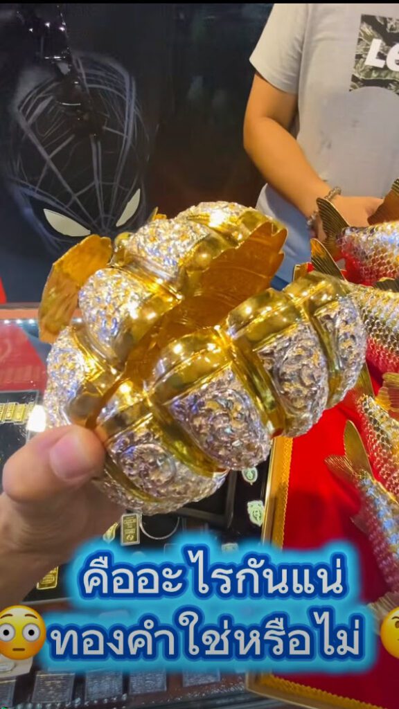 แต่เมื่อนำมาตรวจสอบที่ร้านทอง “บ้านช่างทอง” กลับพบความจริงที่น่าตกใจ — เครื่องสแกนเผยว่า มีทองคำเพียง 4.3% และเงิน 10% ที่เหลือกว่า 80% เป็นทองแดง แสดงว่าเป็นเพียง งานหล่อชุบทอง (Gold Plate) ไม่ใช่งานทองแท้ตามที่ถูกอ้าง