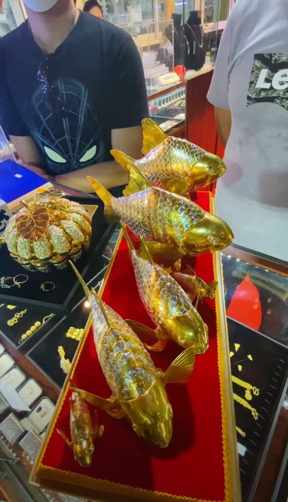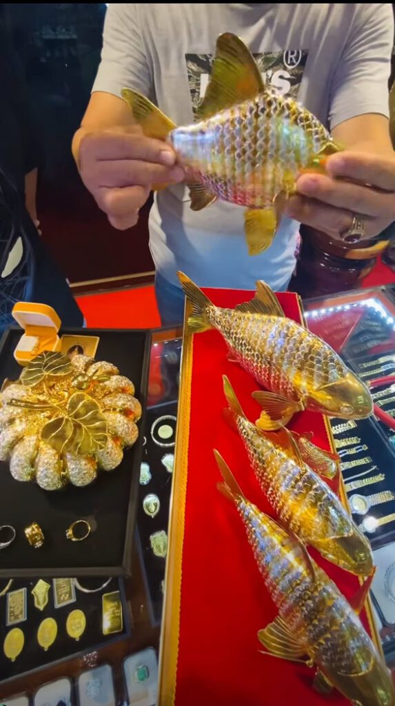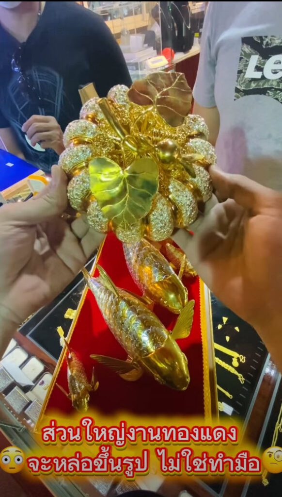 ตกแต่งรูปปลาและภาชนะสีทองอร่าม