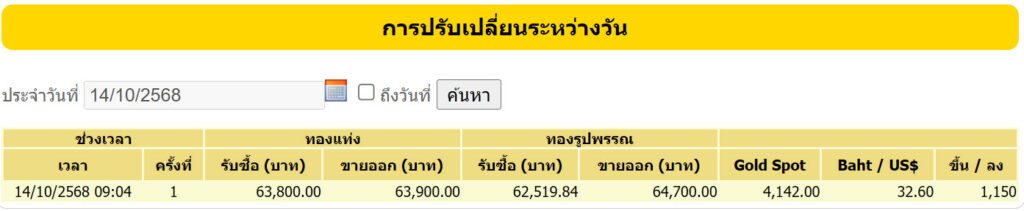 วันนี้ (14 ตุลาคม 2568) ราคาทองคำในประเทศไทยปรับตัวขึ้นแรงมาก ราคาทองตามประกาศของสมาคมค้าทองคำ ปรับราคาครั้งที่ 1 เวลา 09.04 น. ปรับราคาขึ้น 1,150 บาท โดยทำให้ราคาทองคำแท่งขายออกอยู่ที่ 63,900 บาท รับซื้อ 63,800 บาท และทองรูปพรรณขายออกที่ 64,700 บาท รับซื้อ 62,519 บาท