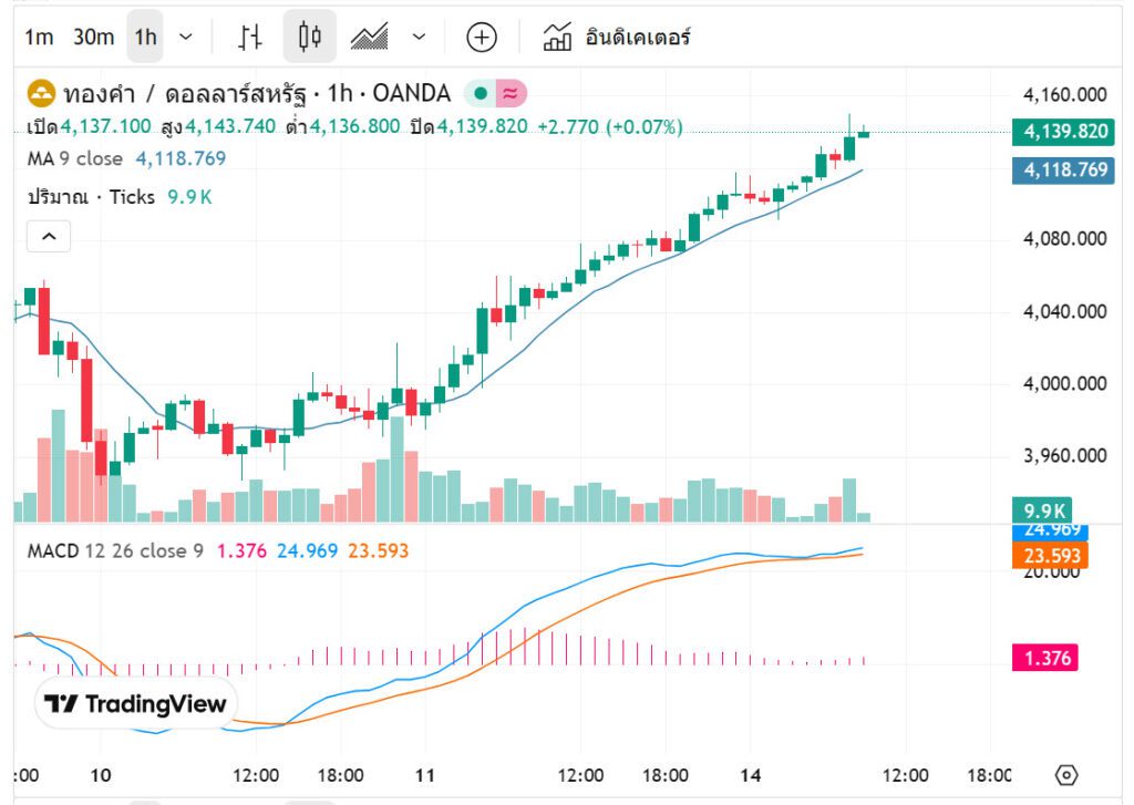 ทองโลกอยู่ในระยะขาขึ้นต่อเนื่อง แต่ในระยะสั้นมีแนวโน้มปรับตัวขึ้นสอบแนวต้านที่ 4,160 ดอลลาร์ และมีการปรับตัวลงในภายหลัง จึงประเมินว่า ทองโลกอาจย่อตัวลงทดสอบแนวรับที่ 4,115 ดอลลาร์ ก่อนกลับตัวเป็นขาขึ้นต่อ แต่หากทองโลกหลุดแนวรับถัดไปที่ 4,100 ดอลลาร์ ทองโลกอาจเข้าสู่การปรับฐานลงระยะสั้น