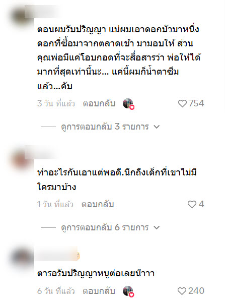 ตอนผมรับปริญญา แม่ผมเอาดอกบัวมาหนึ่งดอกที่ซื้อมาจากตลาดเช้า มามอบให้ ส่วนคุณพ่อมีแค่โอบกอดที่จะสื่อสารว่า พ่อให้ได้มากที่สุดเท่านี้นะ… แค่นี้ผมก็น้ำตาซึมแล้ว…คับ