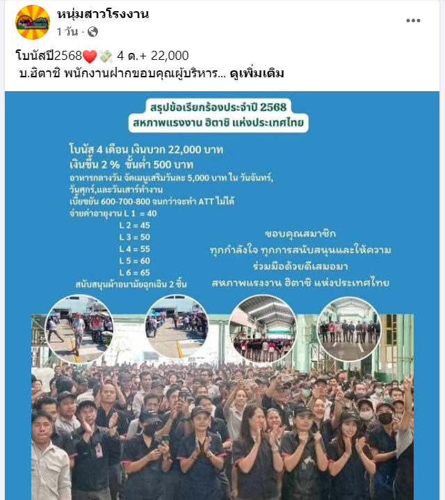โบนัสปี 2568 4 เดือน + 22,000 บ.ฮิตาชิ พนักงานฝากขอบคุณผู้บริหาร และสหภาพแรงงานทุกท่าน สะท้อนบรรยากาศภายในที่ต่างจากบางโรงงานที่ยังเผชิญข้อพิพาทด้านแรงงานอยู่ในขณะนี้