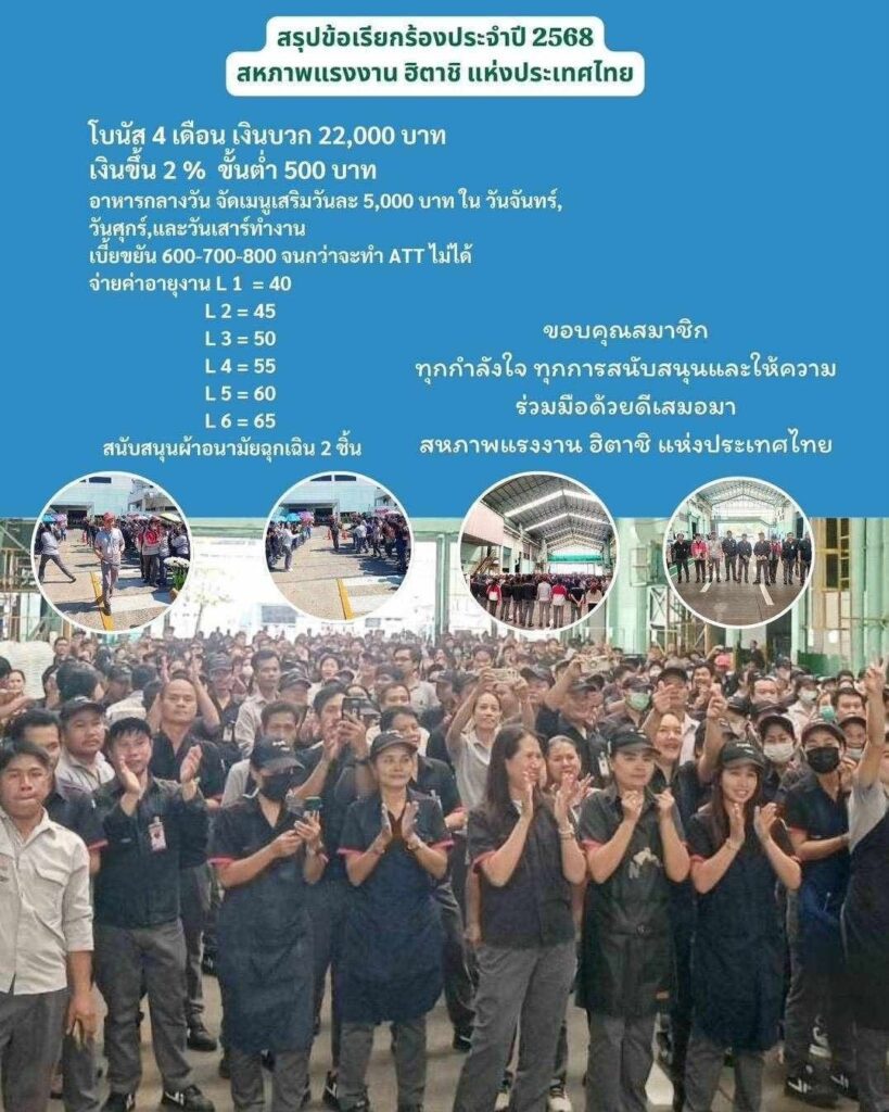 ด้านสหภาพแรงงานฮิตาชิแห่งประเทศไทยยังเปิดเผยรายละเอียดข้อเรียกร้องปี 2568 ที่บริษัทตอบรับ ได้แก่ ปรับขึ้นเงินเดือน 2% ขั้นต่ำ 500 บาท การจัดเมนูอาหารเสริมในวันจันทร์ ศุกร์ และเสาร์ที่มีการทำงาน โครงสร้างเบี้ยขยัน 600–800 บาท และการจ่ายค่าอายุงานตามระดับ L1–L6 รวมถึงสวัสดิการพิเศษอย่างผ้าอนามัยฉุกเฉิน 2 ชิ้น เพื่อช่วยดูแลแรงงานในสถานการณ์เร่งด่วน