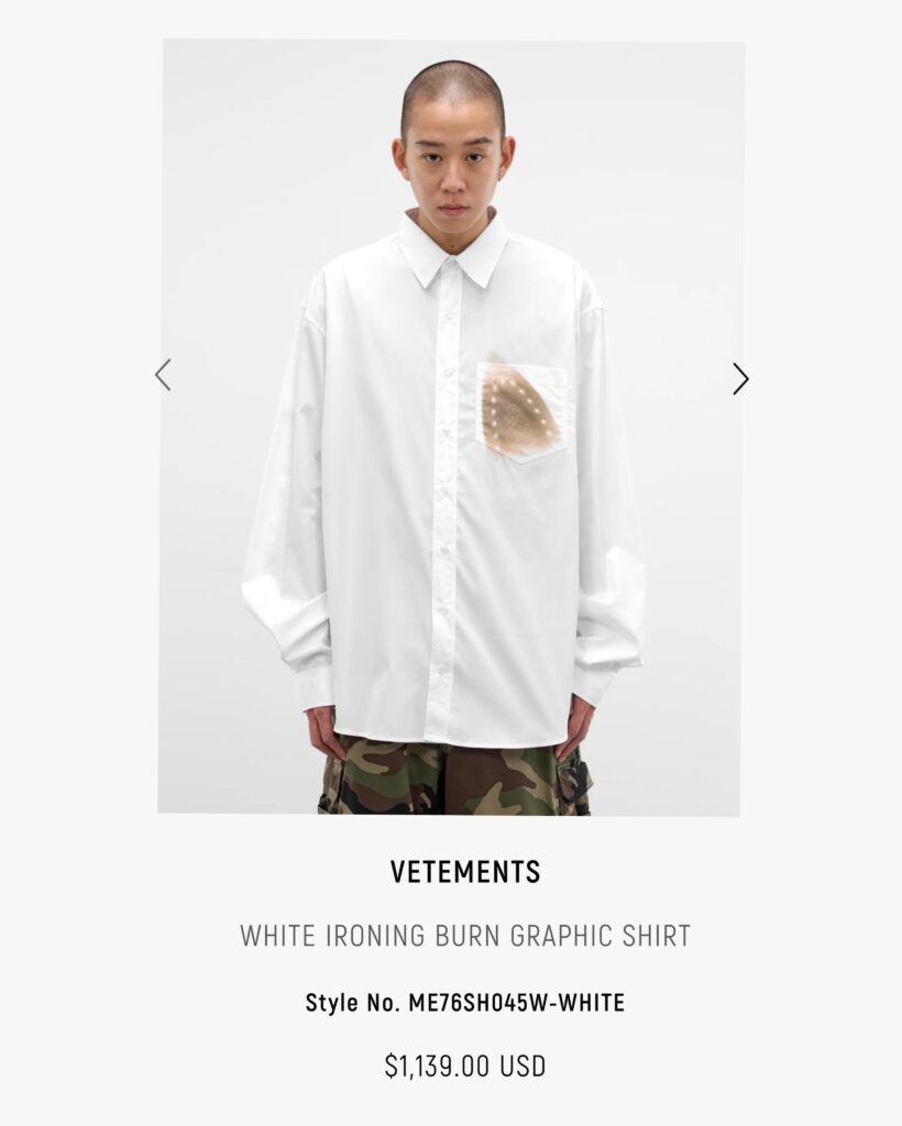 เมื่อวันที่ 19 กุมภาพันธ์ 2569 แบรนด์แฟชั่นหรูชื่อดัง Vetements กลายเป็นประเด็นร้อนในโซเชียลมีเดีย หลังเปิดตัวเสื้อเชิ้ตสีขาวทรงโอเวอร์ไซซ์ ที่มีลายพิมพ์คล้าย “รอยเตารีดไหม้” บริเวณหน้าอก ซึ่งโดยปกติรอยแบบนี้มักเกิดจากอุบัติเหตุในการรีดผ้า
