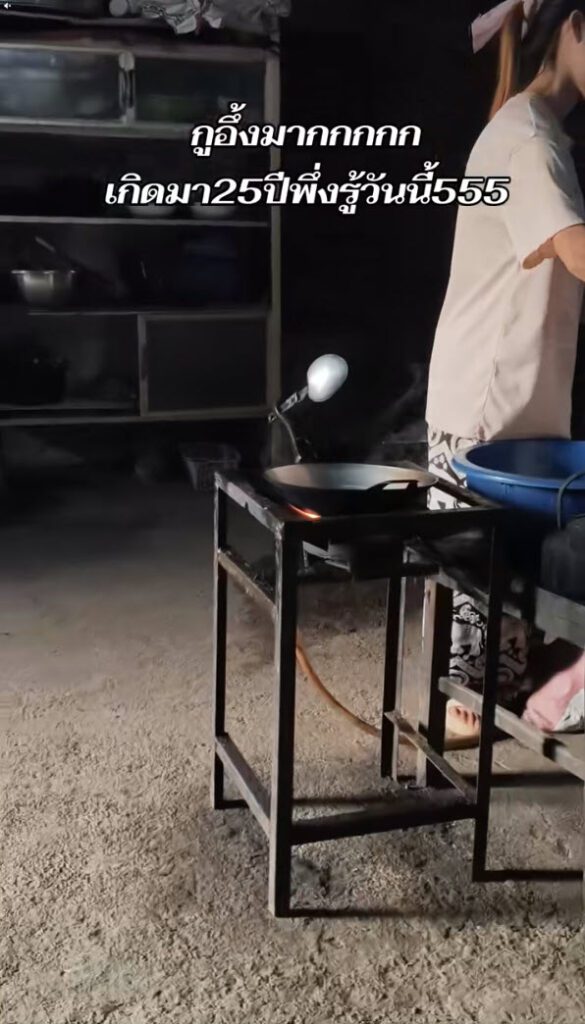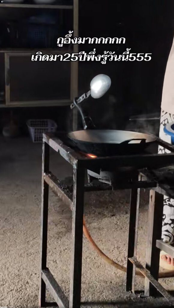 จากภาพในคลิป จะเห็นกระทะตั้งอยู่บนเตา ขณะที่ทัพพีถูกเสียบคาไว้กับช่องหรือขอบของด้ามกระทะอย่างพอดี ทำให้ทัพพีไม่หล่น ไม่เปื้อน และหยิบใช้งานต่อได้ทันที