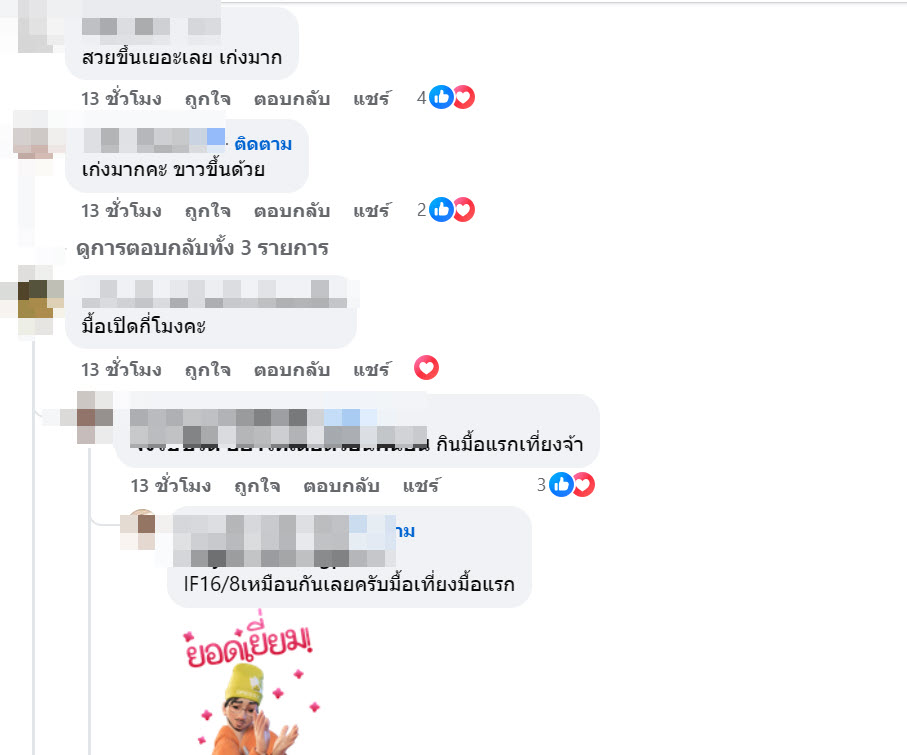 ทำ IF 16/8 มา 9 เดือน ตั้งต้น 85 ตอนนี้เหลือ 58 สูง 160 กินตามมื้อมื้อแรก เที่ยงมื้อจบ2ทุ่มเน้นผักโปรตีน  ข้าวไรซ์เบอรี่ นอนให้พอ ดื่มน้ำวันละ2-3ลิตร งดน้ำตาลทุกวัน นี้ เบาสบายตัวเลยคะ ก่อนลดเหนื่อยง่ายเดินลำบาก  สำคัญสุดแม่ค้าขายเสื้อผ้าบอกไม่มีไซส์เรา  ทุกวันนี้ จะจับชุดไหนเราก้อใส่ได้แล้วนะจ๊ะ