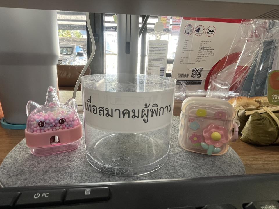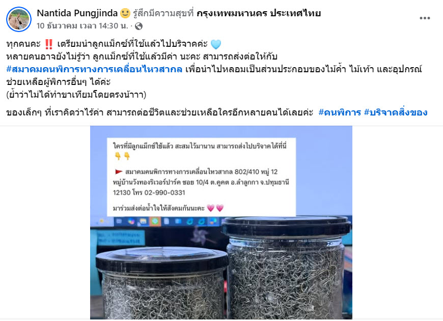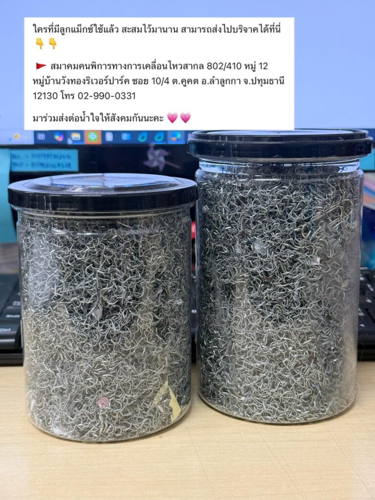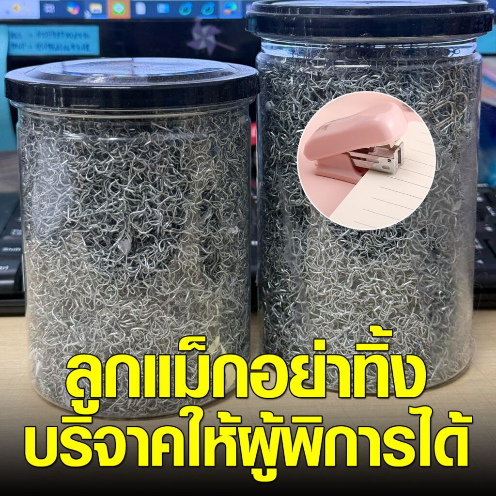 ล่าสุด ทางด้านผู้ใช้เฟสบุ๊ก Nantida Pungjinda ได้โพสต์กระปุกพลาสติกที่เป็นไปด้วยลูกแม็กเย็บกระดาษเต็มกระปุก ที่เต็มไปบริจาคให้กับสมาคมคนพิการทางการเคลื่อนไหวสากลนำไปใช้หลอมเป็นส่วนประกอบของไม้ค้ำ ไม้เท้า และอุปกรณ์ช่วยเหลือผู้พิการอื่นๆ ได้ โดยได้โพสต์ระบุว่า…