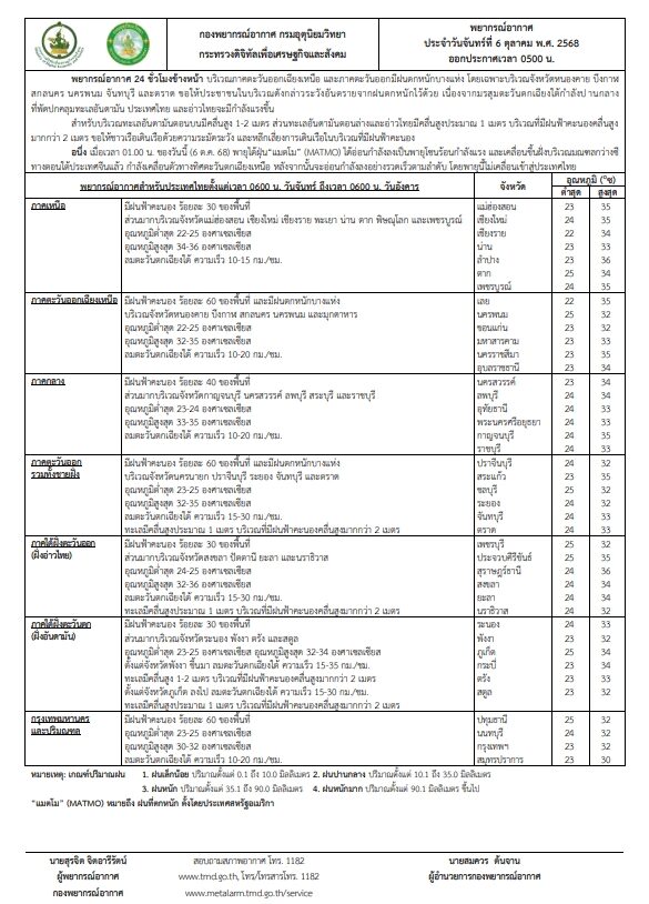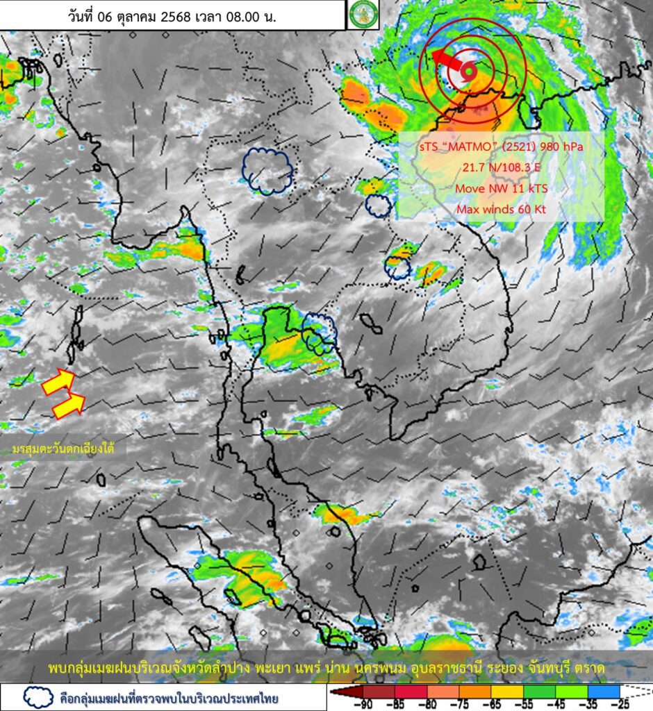 อนึ่ง เมื่อเวลา 01.00 น. ของวันนี้ (6 ต.ค. 68) พายุไต้ฝุ่น “แมตโม” (MATMO) ได้อ่อนกำลังลงเป็นพายุโซนร้อนกำลังแรง และเคลื่อนขึ้นฝั่งบริเวณมณฑลกว่างซี ทางตอนใต้ประเทศจีนแล้ว กำลังเคลื่อนตัวทางทิศตะวันตกเฉียงเหนือ หลังจากนั้นจะอ่อนกำลังลงอย่างรวดเร็วตามลำดับ โดยพายุนี้ไม่เคลื่อนเข้าสู่ประเทศไทย