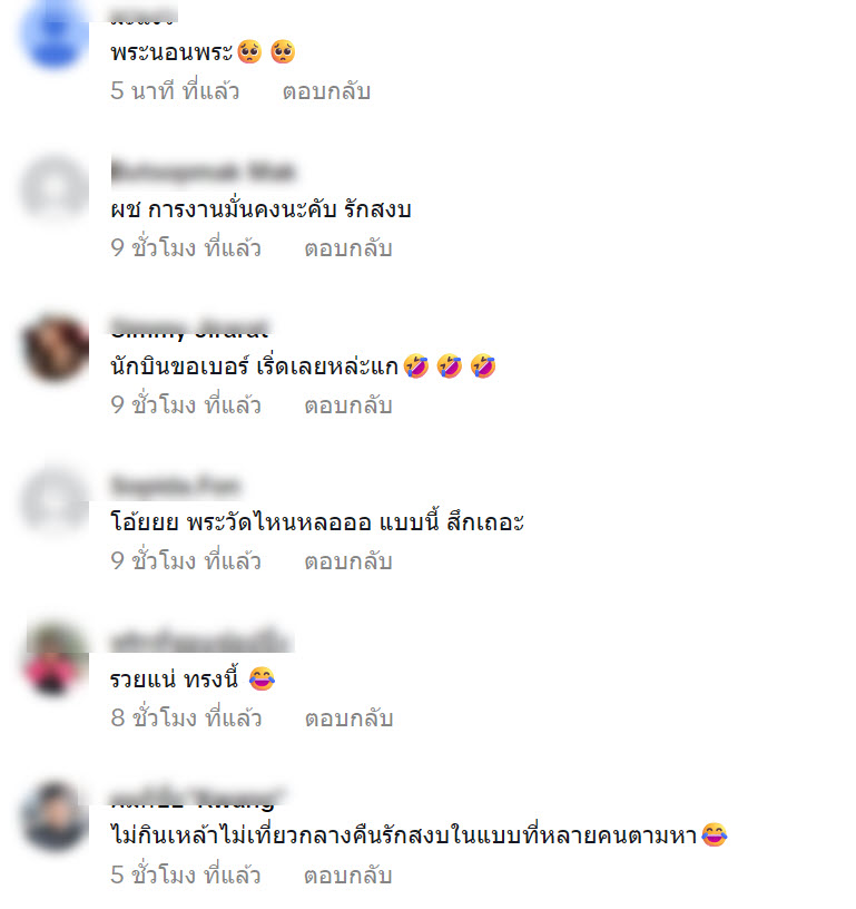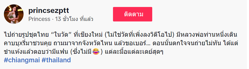 ไปถ่ายรูปชุดไทย “ในวัด” ที่เชียงใหม่ (ไม่ใช่วัดที่เพิ่งลงวิดีโอไป) มีหลวงพ่อท่านหนึ่งเดินคาบบุxรี่มาชวนคุย ถามมาจากจังหวัดไหน แล้วขอเบอร์… ตอนนั้นตกใจจนถ่ายไม่ทัน ได้แต่ขำแห้งแล้วตอบว่ามีแฟน (ซึ่งไม่มี) แต่ละมื้อแต่ละเดย์สุดๆ