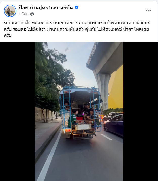 “รถขนความฝันของพวกเราหมอนทอง ขอบคุณทุกแรงเชียร์จากทุกท่านด้วยนะครับ รอบต่อไปยังมีเรา มาเกินความฝันแล้ว ลุ้นกันไปทีละแมตช์ น้ำตาไหลเลยครับ”