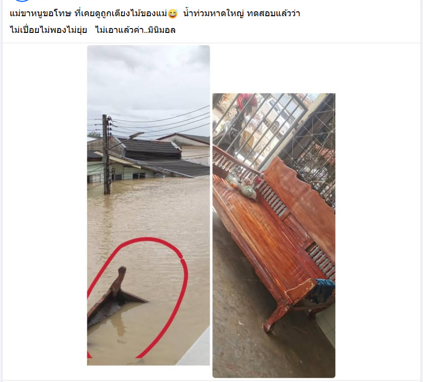 “แม่ขาหนูขอโทษ ที่เคยดูถูกเตียงไม้ของแม่ น้ำท่วมหาดใหญ่ทดสอบแล้วว่า ไม่เปื่อย ไม่ยุ่ย ไม่เอาแล้วมินิมอล”