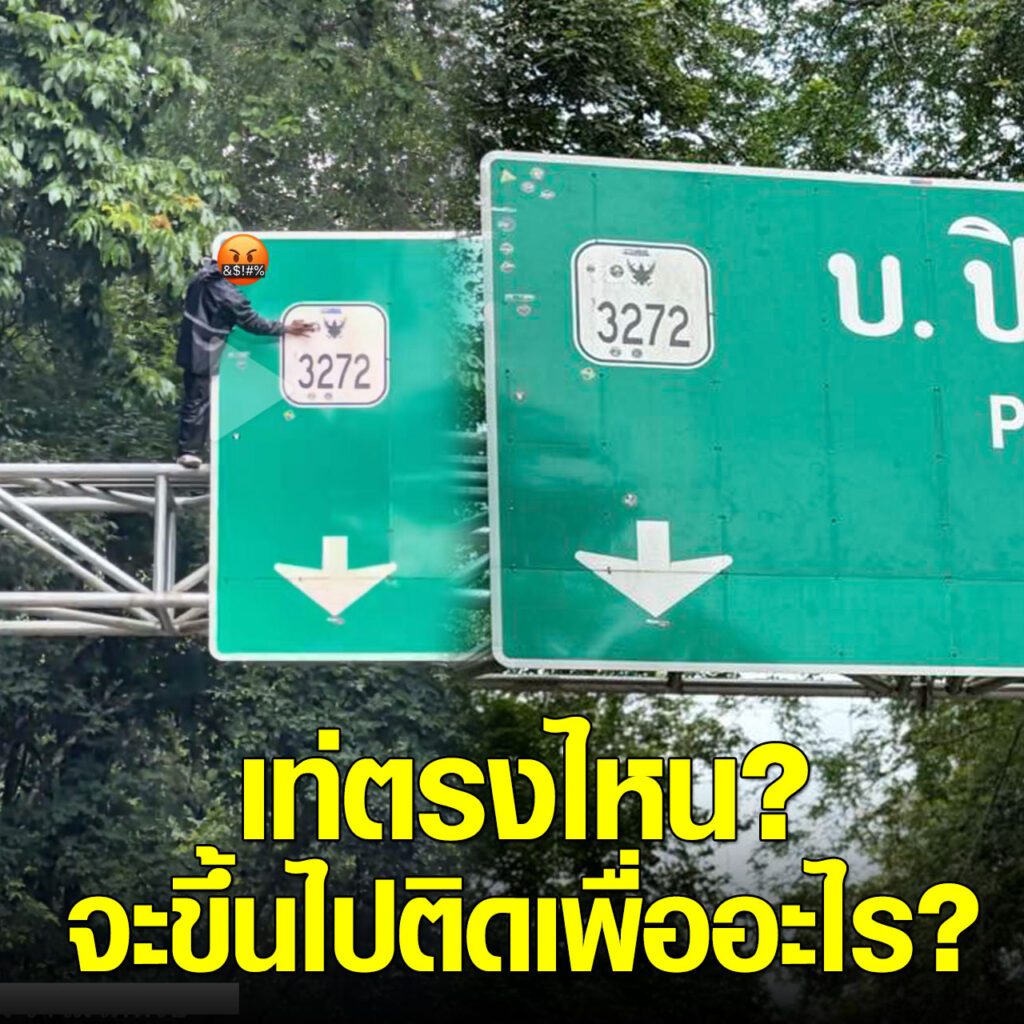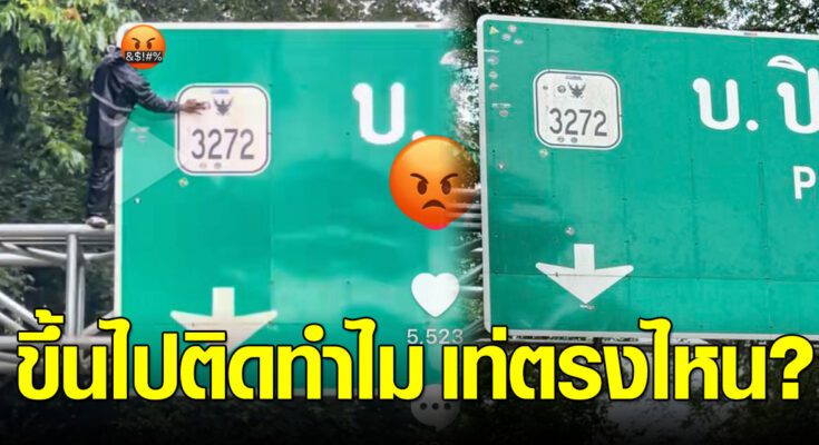เท่ตรงไหน? วัยรุ่นสองล้อขึ้นไปติดสติ๊กเกอร์กลุ่มบนป้ายจราจร จวกยับเลอะเทอะ