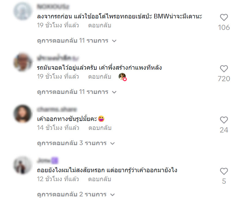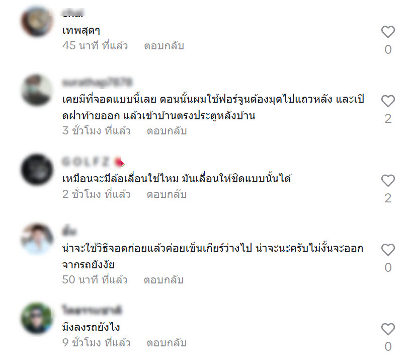 นอกจากจะตกใจเรื่องการถอยเข้าจอดในที่แคบแล้ว ยังสงสัยว่าถอยเข้าไปจอดแล้วออกจากรถยังไง หลายคนว่าน่าจะออกประตูหลัง ฮาๆ