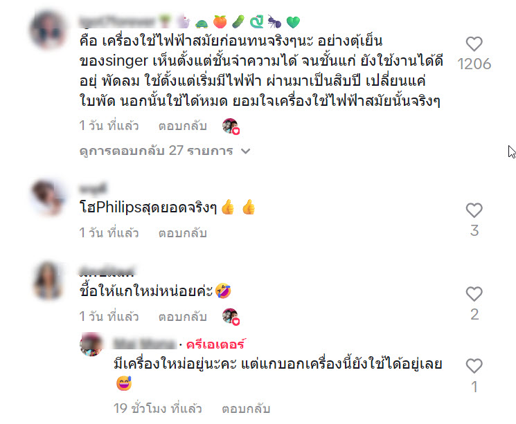 คือ เครื่องใช้ไฟฟ้าสมัยก่อนทนจริงๆนะ อย่างตุ้เย็นของsinger เห็นตั้งแต่ชั้นจำความได้ จนชั้นแก่ ยังใช้งานได้ดีอยุ่ พัดลม ใช้ตั้งแต่เริ่มมีไฟฟ้า ผ่านมาเป็นสิบปี เปลี่ยนแค่ใบพัด นอกนั้นใช้ได้หมด ยอมใจเครื่องใช้ไฟฟ้าสมัยนั้นจริงๆ