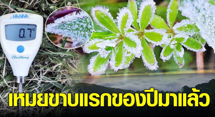 วันที่ 24 พ.ย. ผู้สื่อข่าวรายงานว่า บริเวณ ยอดดอยอินทนนท์ จ.เชียงใหม่ อุณหภูมิลดต่ำสุดในรอบปี เหลือเพียง 4 องศาเซลเซียส ขณะที่อุณหภูมิยอดหญ้าดิ่งลงเหลือ 0.7 องศาเซลเซียส เย็นจัดจนเกิดปรากฏการณ์ “เหมยขาบ” หรือแม่คะนิ้ง เคลือบยอดหญ้าและพื้นผิวจนเป็นประกายขาวสวยงาม ถือเป็นสัญญาณหนาวแรกอย่างเป็นทางการของฤดูกาลนี้