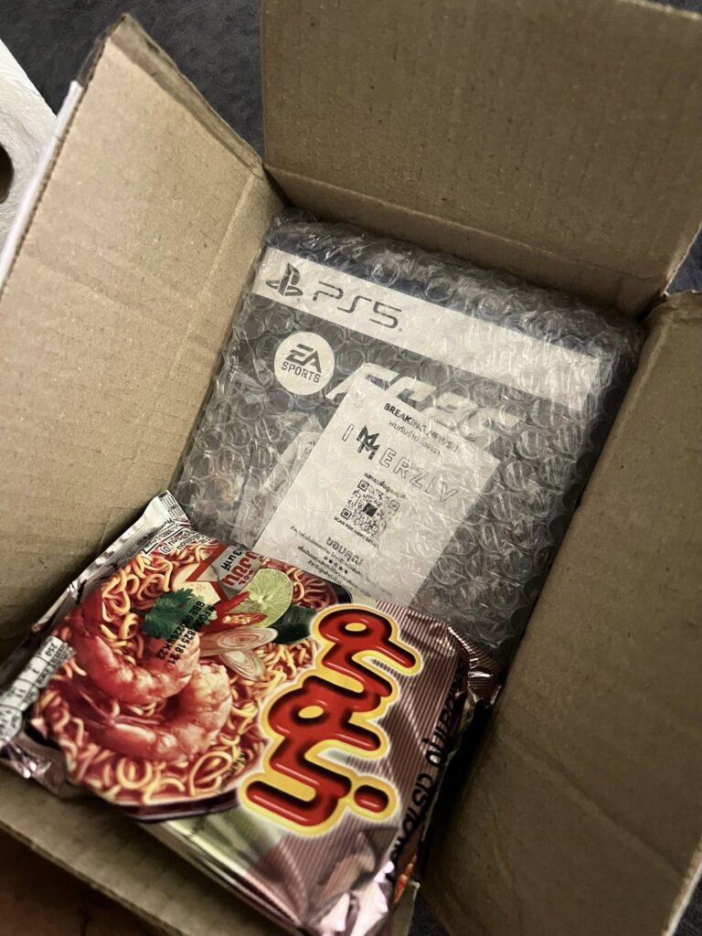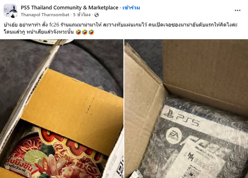 ล่าสุด ทางด้านผู้ใช้เฟสบุ๊ก Thanapol Tharnsombat โพสต์ในกลุ่ม PS5 Thailand Community & Marketplace ได้โพสต์ภาพเมื่อสั่งเกม EA Sports FC 26 เปิดกล่องออกดูแว็บแรกแทบช็อก คิดว่าโดนหลอกแล้วแน่ๆ เพราะว่าเจอซองมาม่า พอเปิดดูเต็มๆ ถึงกับใจหาย ทางร้านก็ใจดีเกิน โดยได้โพสต์ระบุว่า…