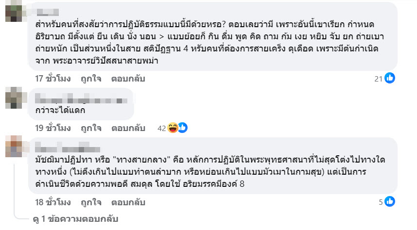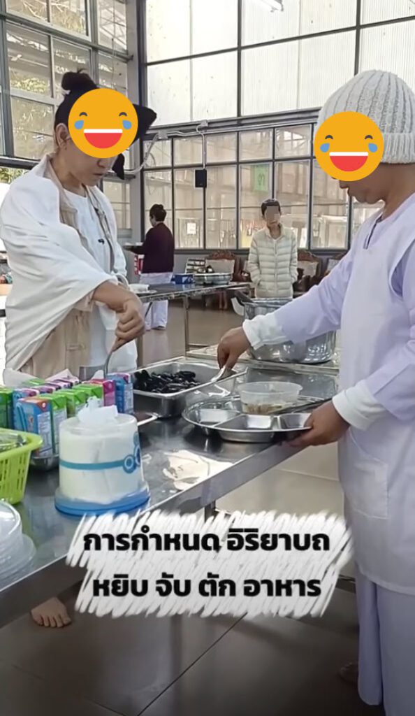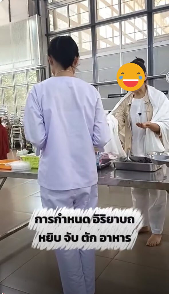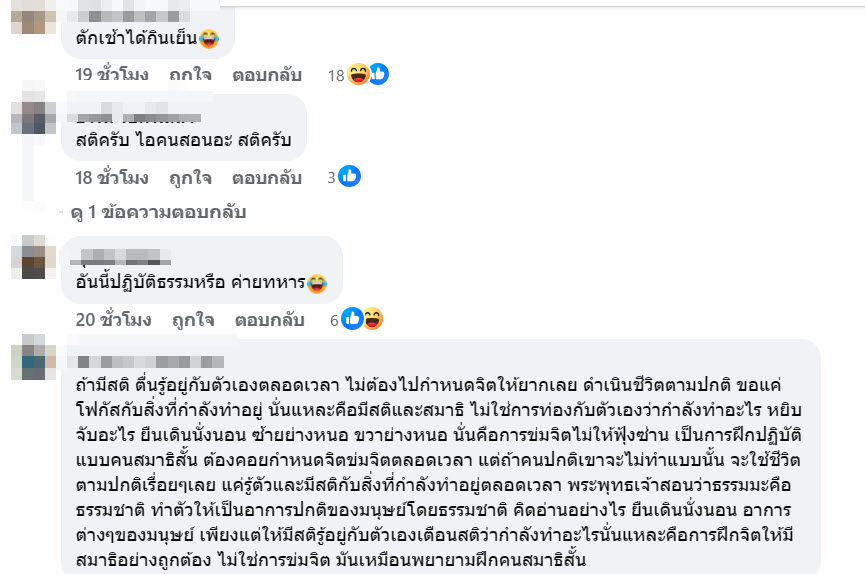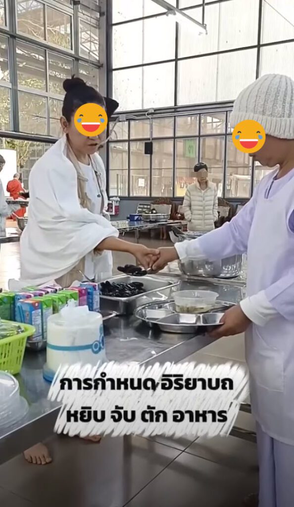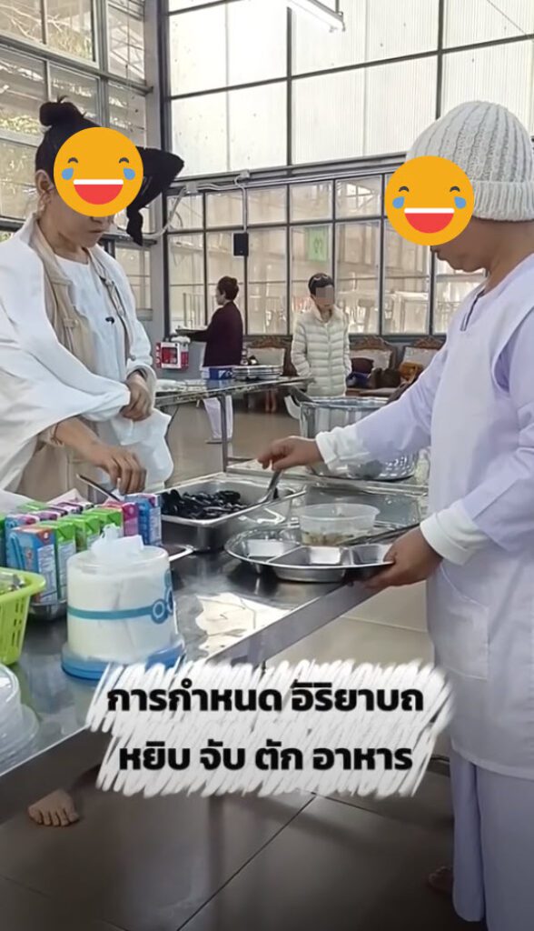 จะตักจะยกจะวางแต่ละจังหวะต้องกำหนดรู้ ช้าเป็นตัวสลอธเลย เป็นการกำหนดอริยาบถ หยิบ จับ ตัก อาหาร ใครไหวไปก่อนเลย ตักตอนเช้าอาจจะได้กินตอนเย็นช้าขนาดนี้ ทางสายกลางพอดีๆ แค่มีสติ รู้ตัวก็พอแล้วมั้ง