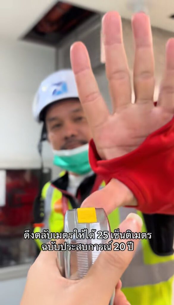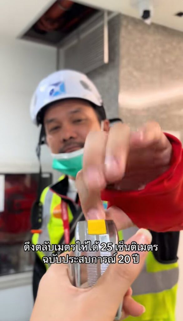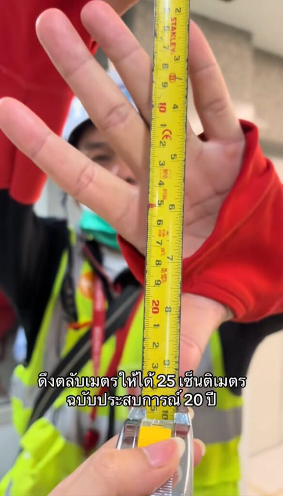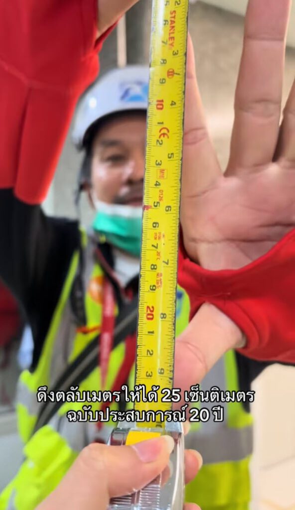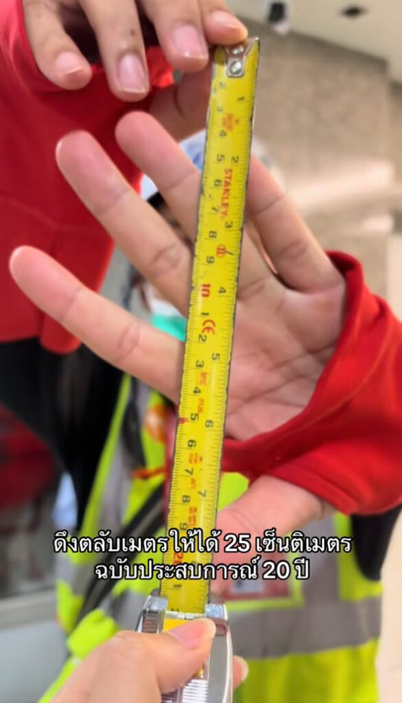 ประสบการณ์ล้วนๆ เลย ดูจากมือแล้วพี่เขาจะมีสูตรในการกะระยะได้ประสบการณ์จากการทำงาน ดึงตลับเมตรได้ตรงเป๊ะเลย สุดยอดมาก สมแล้วกับประสบการณ์ 20 ปี