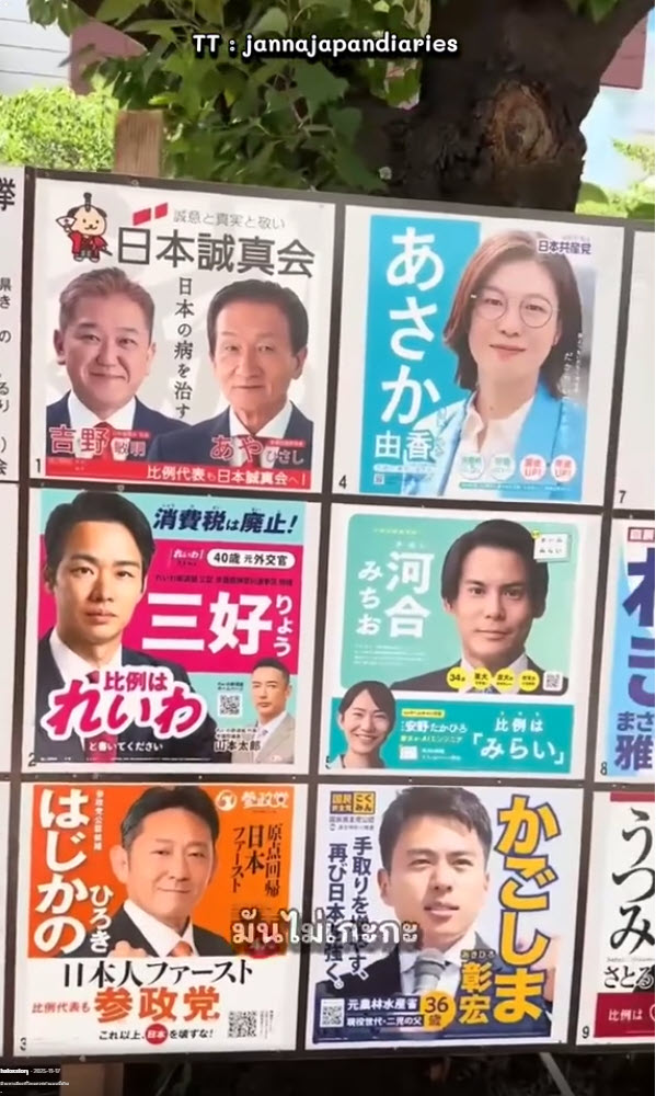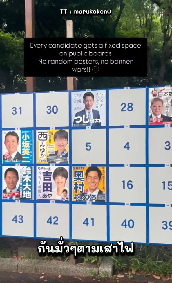 ล่าสุด ทางด้านผู้ใช้ TikTok @haloxstory ได้โพสต์วิดีโอคลิปป้ายหาเสียงที่ไทยคนเอาเป็นแบบอย่าง คือ ป้ายหาเสียงที่ญี่ปุ่น เป็นระเบียบมากๆ ป้ายหาเสียงแบบญี่ปุ่นมีจุดเด่นอยู่ที่ ความมินิมัลและความเป็นระเบียบ ภายใต้กฎระเบียบที่เคร่งครัดเพื่อรักษาทัศนียภาพของเมือง โดยในปี 2025 และ 2026 ญี่ปุ่นได้มีการปรับปรุงกฎหมายเพื่อป้องกันปัญหาเรื่องความเหมาะสมบนป้ายหาเสียงเพิ่มเติมด้วย บอร์ดรวม ผู้สมัครไม่สามารถติดป้ายตามเสาไฟฟ้าหรือทางเท้าได้เอง แต่ต้องติดบน บอร์ดกลาง ที่ทางรัฐจัดเตรียมไว้ให้ในจุดต่างๆ ทั่วเมือง