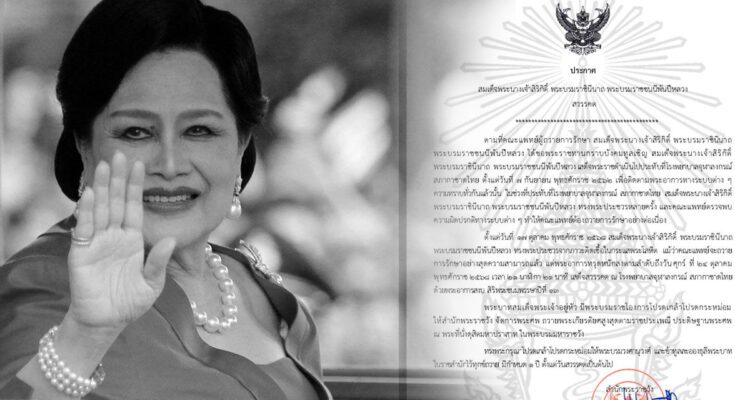 เมื่อวันศุกร์ที่ 24 ตุลาคม พุทธศักราช 2568 เวลา 21 นาฬิกา 21 นาที สมเด็จพระนางเจ้าสิริกิติ์ พระบรมราชินีนาถ พระบรมราชชนนีพันปีหลวง เสด็จสวรรคต ณ โรงพยาบาลจุฬาลงกรณ์ สภากาชาดไทย ด้วยพระอาการสงบ สิริพระชนมพรรษา 93 พรรษา