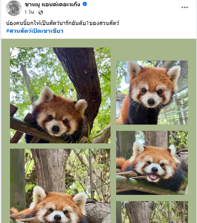 วันที่ 29 ตุลาคม 2569 เฟซบุ๊กเพจ ขาหมู แอนด์เดอะแก๊ง ได้โพสต์ภาพสุดน่ารักของ แพนด้าแดง จาก สวนสัตว์เปิดเขาเขียว อำเภอศรีราชา จังหวัดชลบุรี พร้อมแคปชันว่า…