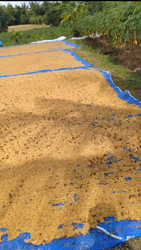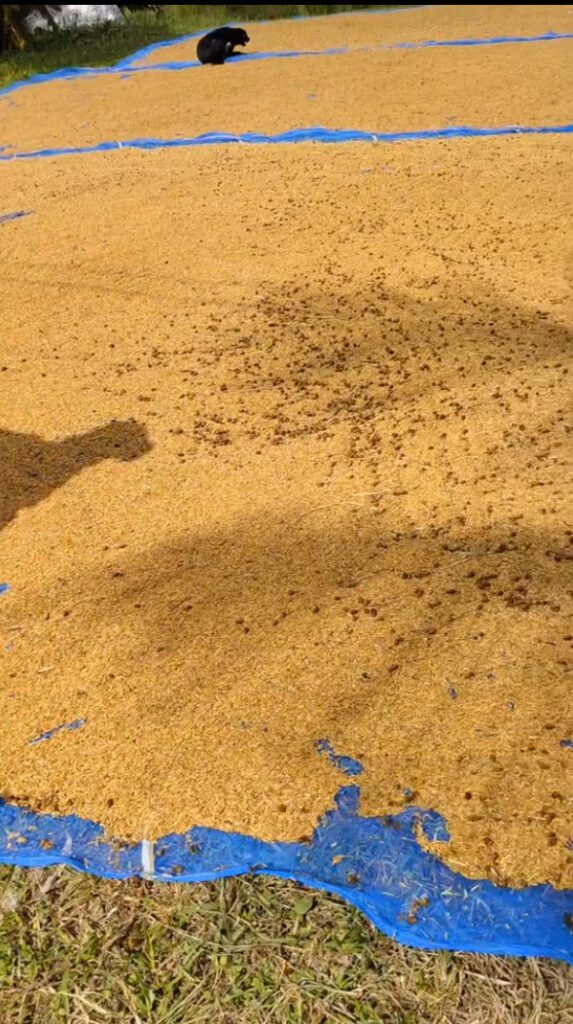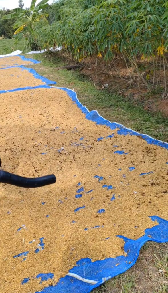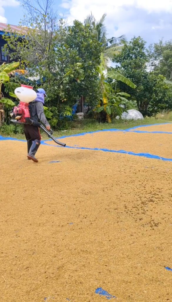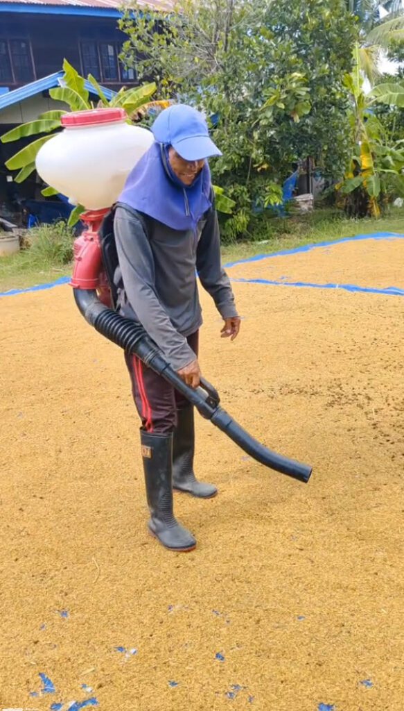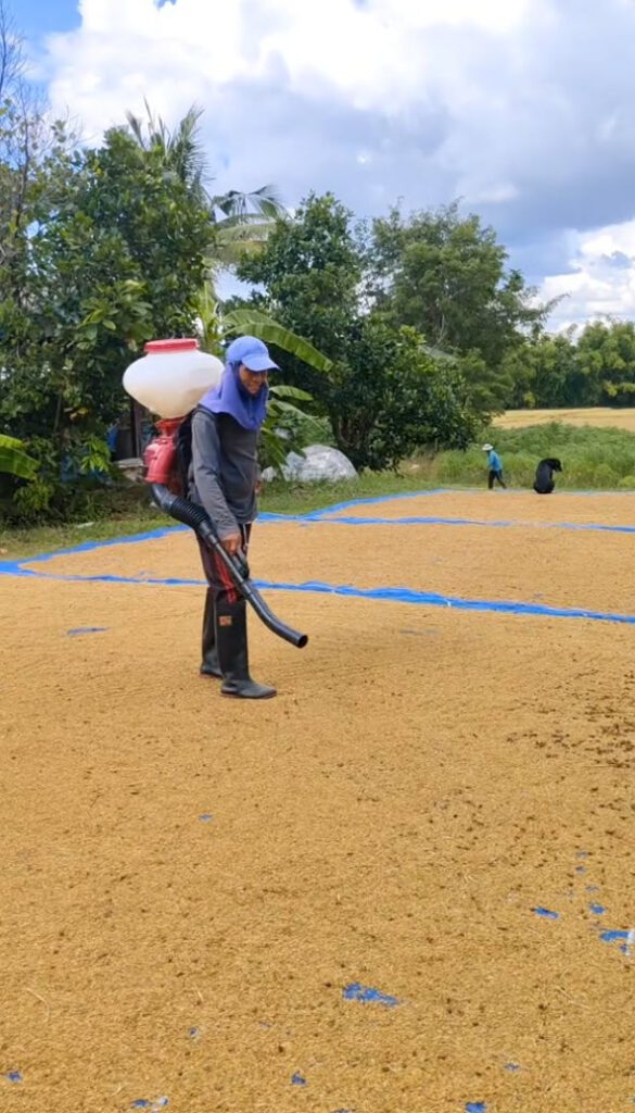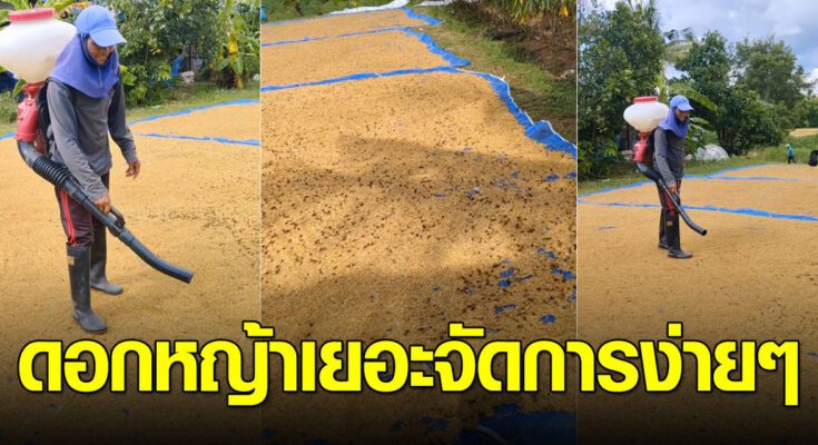 เอาเครื่องพ่นปุ๋ยมาใช้เป่าดอกหญ้าออกจากข้าวเปลือกที่ตาก ง่ายเลย ไม่ต้องกวาดให้เหนื่อย วิธีนี้ออกได้ง่ายกว่าเยอะมากๆ ช่วยทุ่นแรงได้เยอะเลย