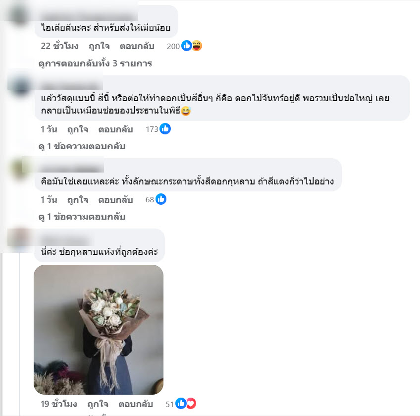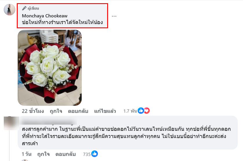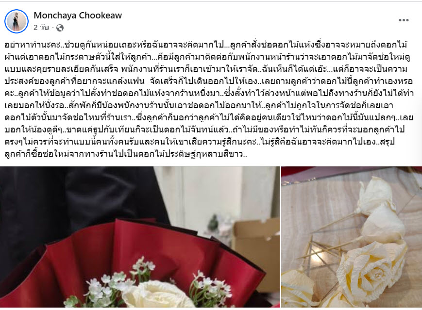 ซึ่งลูกค้าก็บอกว่าลูกค้าไม่ได้คิดอยู่คนเดียวใช่ไหมว่าดอกไม้นี้มันแปลกๆ เลยบอกให้น้องดูดีๆ ขาดแค่ธูปกับเทียนก็จะเป็นดอกไม้จันทน์แล้ว ถ้าไม่มีของหรือทำไม่ทันก็ควรที่จะบอกลูกค้าไปตรงๆไม่ควรที่จะทำแบบนี้คนทั้งคนรับและคนให้เขาเสียความรู้สึกนะคะ ไม่รู้สิคือฉันอาจจะคิดมากไปเอง สรุปลูกค้าก็ซื้อช่อใหม่จากทางร้านไปเป็นดอกไม้ประดิษฐ์กุหลาบสีขาว