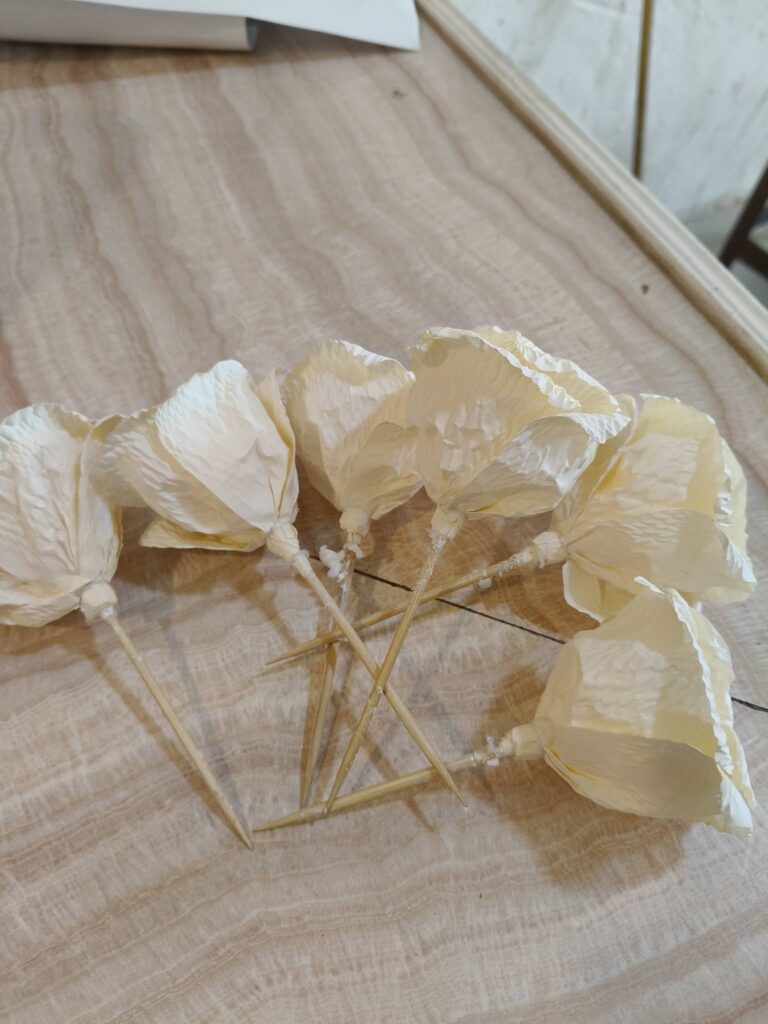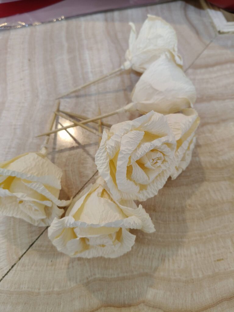 แล้ววัสดุแบบนี้ สีนี้ หรือต่อให้ทำดอกเป็นสีอื่นๆ ก็คือ ดอกไม้จันทร์อยู่ดี พอรวมเป็นช่อใหญ่ เลยกลายเป็นเหมือนช่อของประธานในพิธี