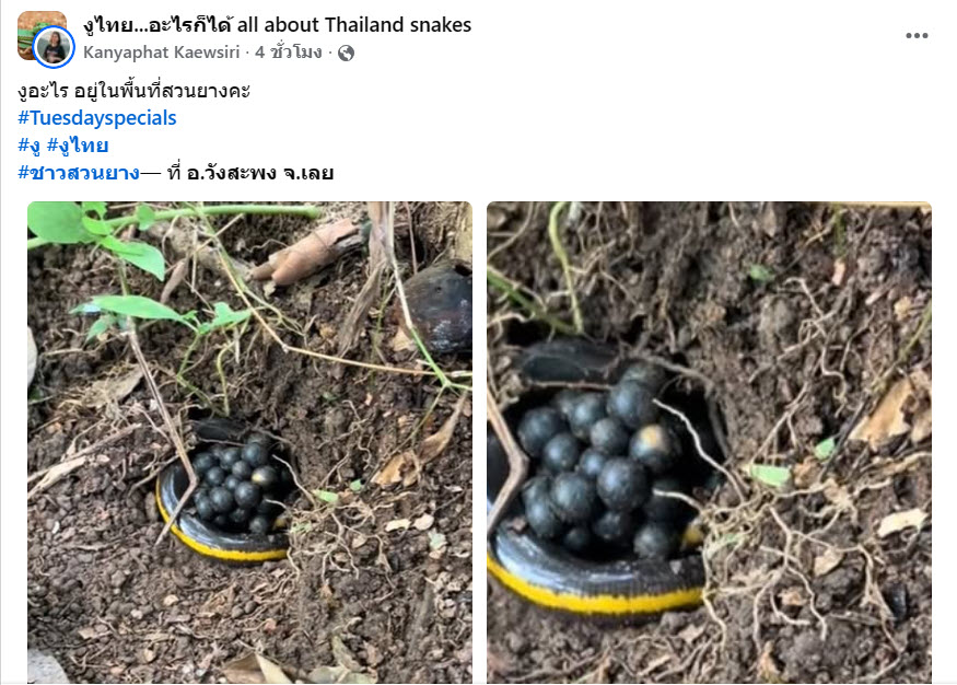 ล่าสุด ทางด้านผู้ใช้เฟสบุ๊ก Kanyaphat Kaewsiri ได้โพสต์วิดีโอคลิปเห็นคล้ายๆ งูอยู่ในดิน กำลังนอนขดไข่สีดำเอาไฟ จำนวนเยอะมาก อยากรู้ว่าเป็นงูอะไร  ชาวเน็ตไขข้อสงสัยแท้จริงคล้ายงู แต่ไม่ใช่งู โดยได้โพสต์ระบุว่า..