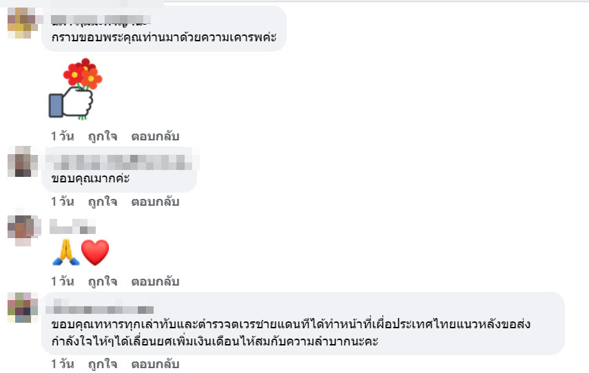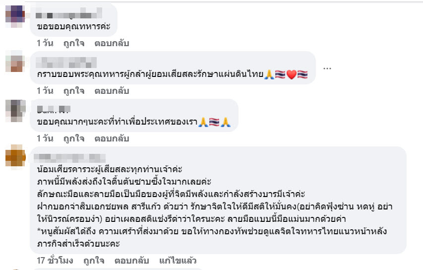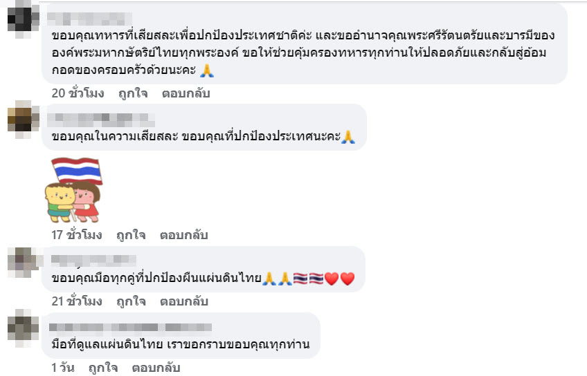 ภายหลังการเผยแพร่โพสต์ดังกล่าว มีประชาชนจำนวนมากร่วมแสดงความคิดเห็น แสดงความขอบคุณและชื่นชมในความกล้าหาญของทหารไทย อาทิ การกราบขอบพระคุณทหารทุกเหล่าทัพและอาสาสมัครที่ช่วยปกป้องผืนแผ่นดินไทย รวมถึงคำซาบซึ้งต่อสองมือที่เป็นเกราะคุ้มกันให้ประชาชนไทยอยู่เย็นเป็นสุข