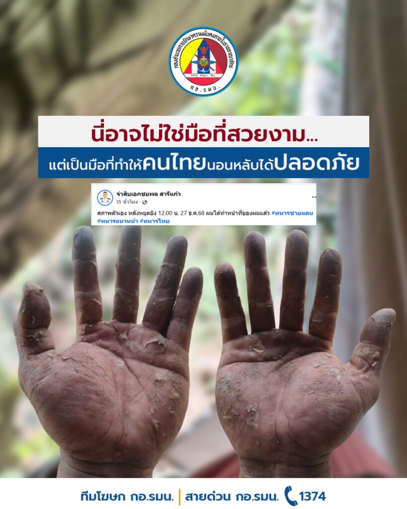 ภาพฝ่ามือที่เต็มไปด้วยรอยแผล ไม่ได้สะท้อนเพียงความเหน็ดเหนื่อยจากการปฏิบัติหน้าที่ แต่ยังเป็นสัญลักษณ์ของหัวใจนักรบผู้ยอมเสียสละเพื่อประเทศชาติ ความกล้าหาญและความทุ่มเทของทหารไทยทุกนาย คือพลังเงียบที่คอยปกป้องแผ่นดิน และเป็นความภาคภูมิใจของคนไทยทั้งชาติ