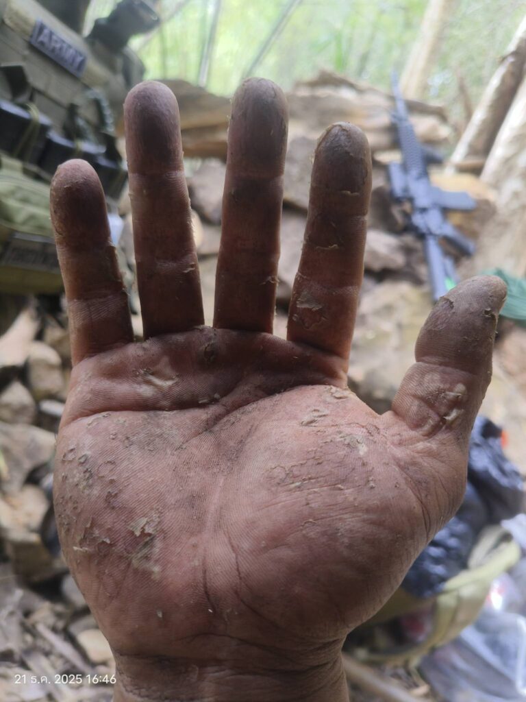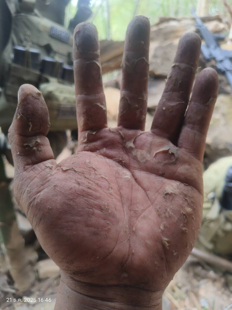 รอยลอกและบาดแผลแตกบนฝ่ามือ เป็นหลักฐานของความยากลำบากจากการปฏิบัติหน้าที่ท่ามกลางแสงแดด ความเหนื่อยล้า และความเสี่ยง เพื่อให้คนไทยอีกหลายสิบล้านคนได้ใช้ชีวิตและพักผ่อนอย่างปลอดภัย แม้ความเสียสละนี้จะไม่ได้รับคำสรรเสริญในทุกวัน แต่คำว่า “ชาติ” คือสิ่งที่ทหารกล้าผู้นี้ยึดถือไว้เหนือชีวิตของตนเองเสมอ